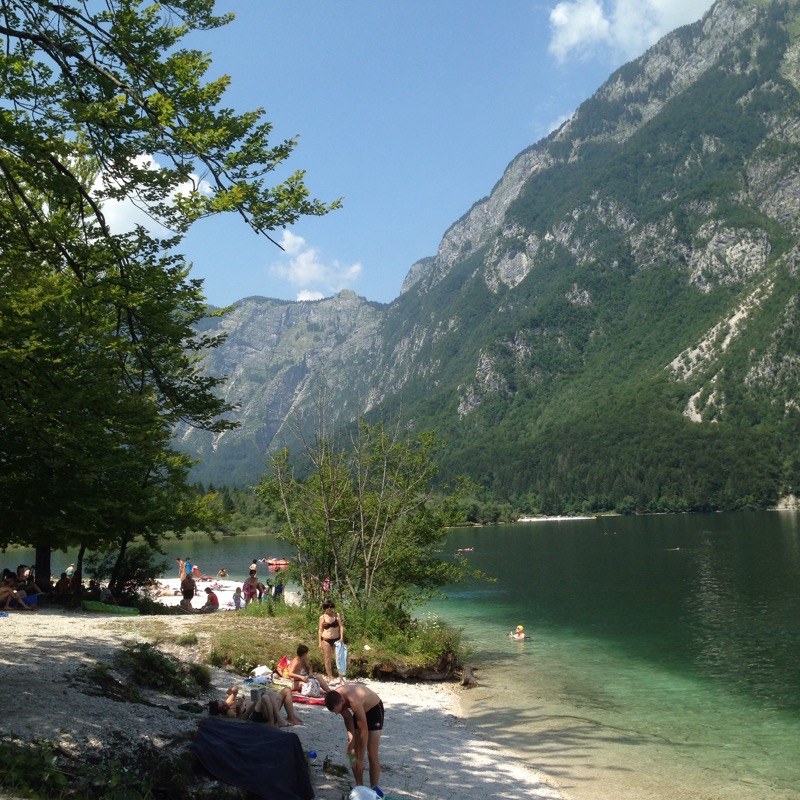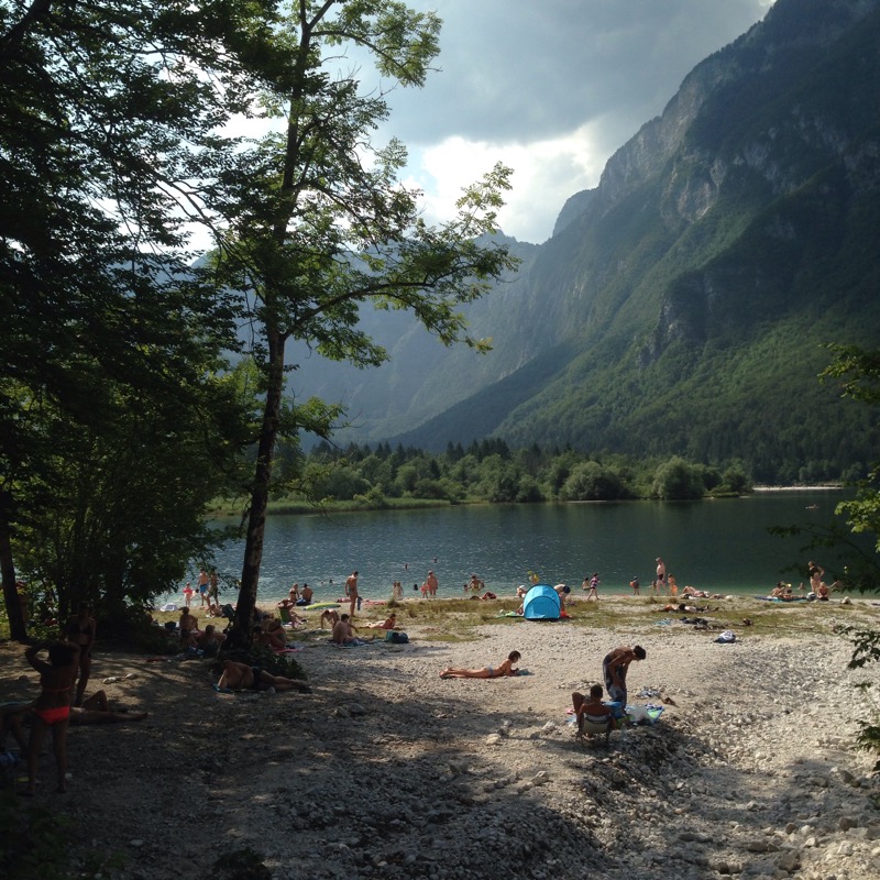 At least I thought so until we arrived this morning into the campsite at the far end of Bohinjsko lake. A dead end hard up against the ring of peaks at the end of the valley with sheer cliffs and wooded gorges dropping into the waters and white limestone beaches, this place is a wonder. I wouldn’t have imagined I could feel so chilled in a camp as busy as this but the sheltering and shading trees, vast empty lake, towering mountains and general vibe have made for a totally relaxed atmosphere here.