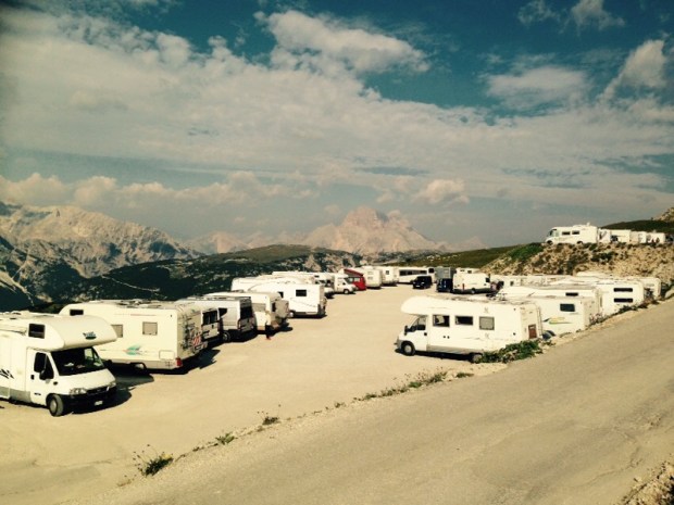 The village of Misurina had a camp site and camper park at the beginning of a toll road leading into the iconic peaks that are featured in most illustrations of these mountains. We started up early again to give Tranny cold air around her/his radiator on the climb.