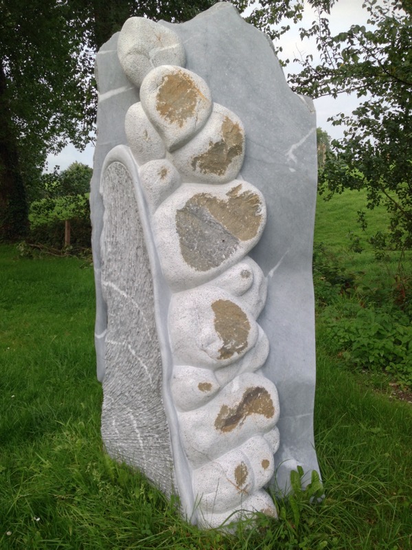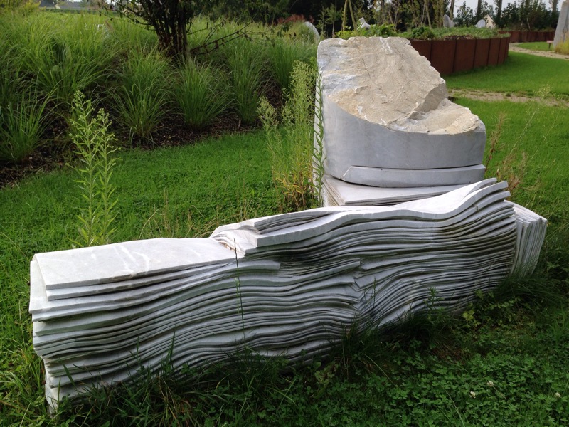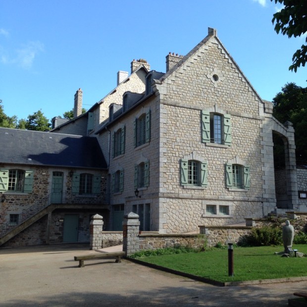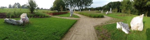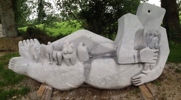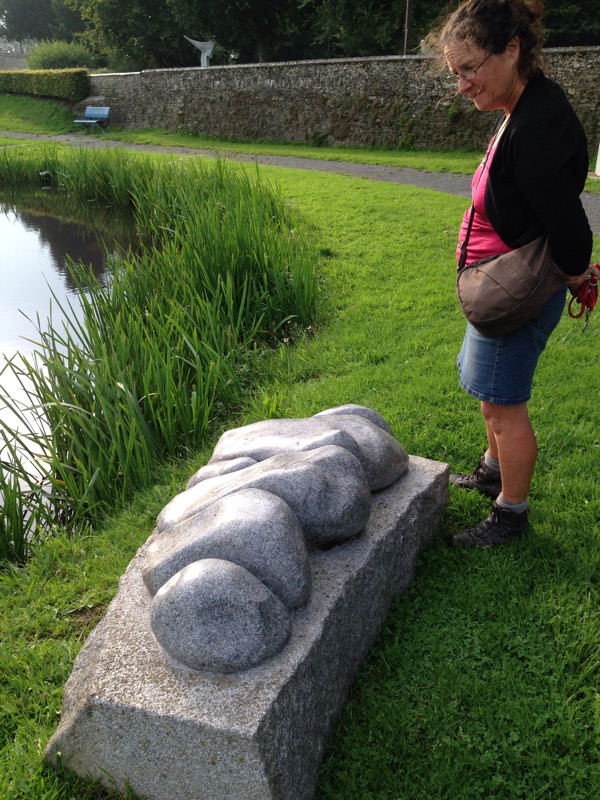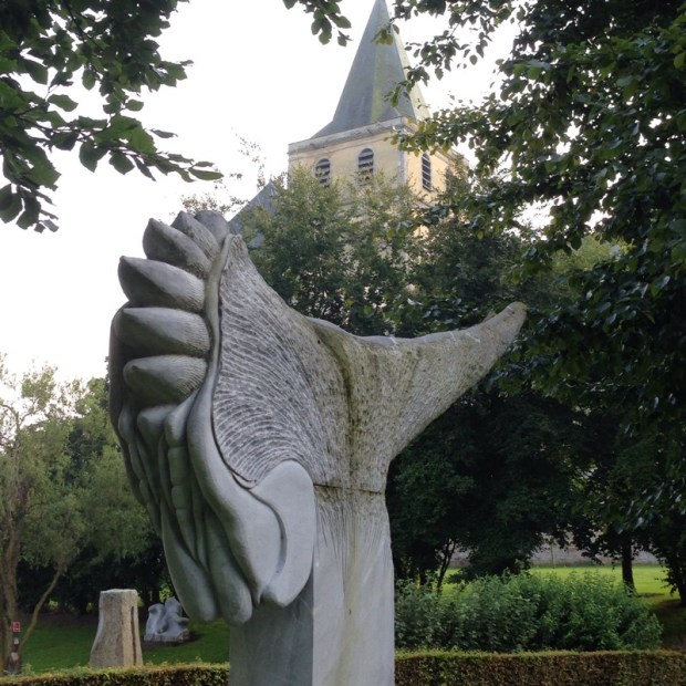 We were gradually making our way north towards Cherbourg and the end of our time away. We had one more night on the road and we trusted our parkup guide to supply somewhere nice en route. It didn’t let us down and when we arrived at the Abbey in Cerisy le Foret at the edge of a huge oak forest we were delighted to find a sculpture park had been created there. Every year since the mid 90’s artists from around the world had been invited to an annual festival to carve a piece in public and in 2013 a park was made to house 112 works by 71 sculptors from 34 countries and the municipal camper park was in the middle of it.