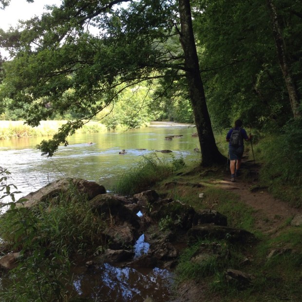 Back on track we climbed up through heathy woodland to traverse an escarpment before descending to the river and Tranny.