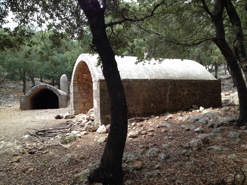 but mostly just quiet reminders of another time when the hills were alive with charcoal and lime makers, building their huts and bread ovens and living with their families on site from spring to autumn. On the high mountains the snow collectors came to make ice in the winter in huge underground stone pits. There are also remains of amazingly constructed water storage tanks and underground reservoirs. They had a lot of material.