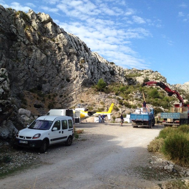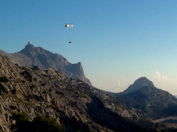 Whilst peering at the landscape below( that’s Port de Soller in the sunshine) I heard the clattering of a helicopter and could then see it circling around high up the Baranc de Biniaraix. A little later as I headed down the more open level valley towards the , fairly dry, reservoir at Cuber it came roaring overhead and then continued to make dozens of delivery runs with building materials, wether for the trail or the houses I couldn’t say.