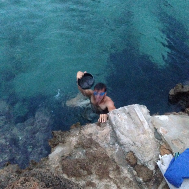 After satisfying the craving for food and drink I couldn’t resist the sea again before we carried on for another 3 hours and finding home for the night, a simple shelter with level concrete floor on a beautiful clear water cove where I yet again could not resist its allure. Later David also had to go diving to retrieve his dropped saucepan.