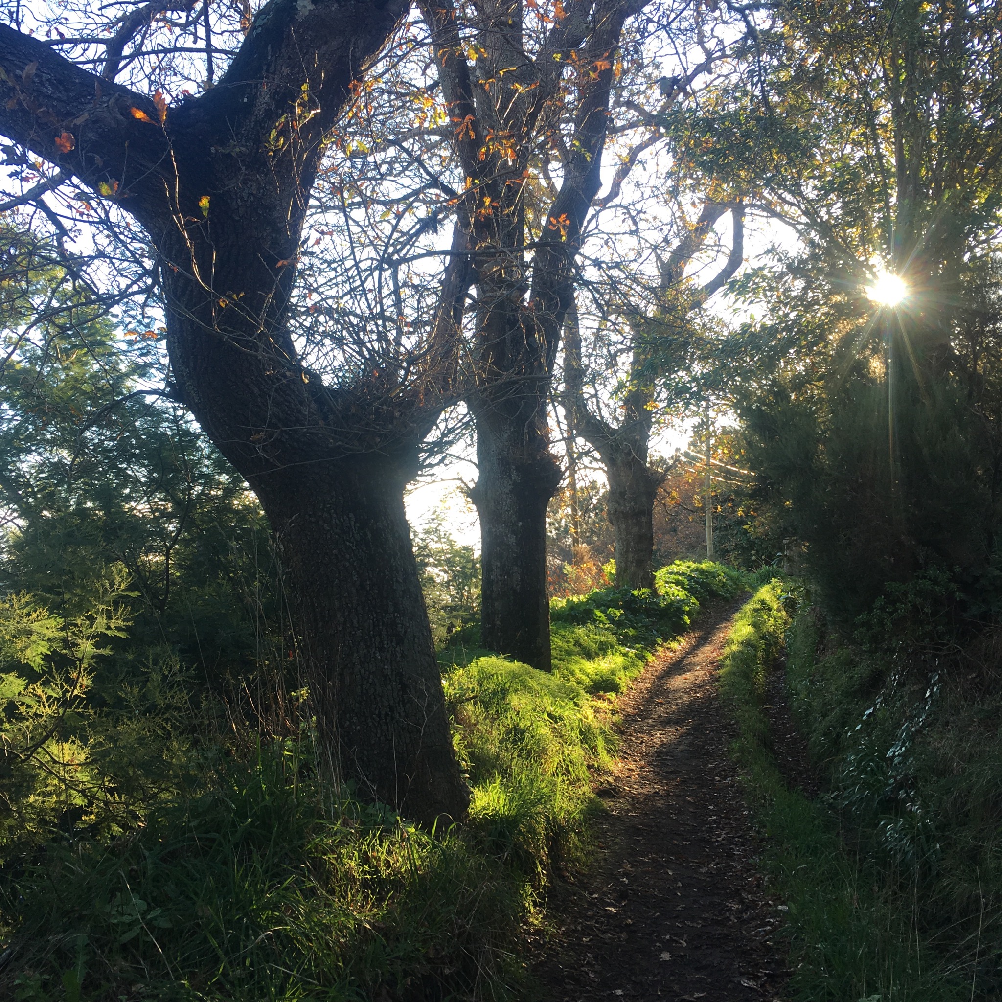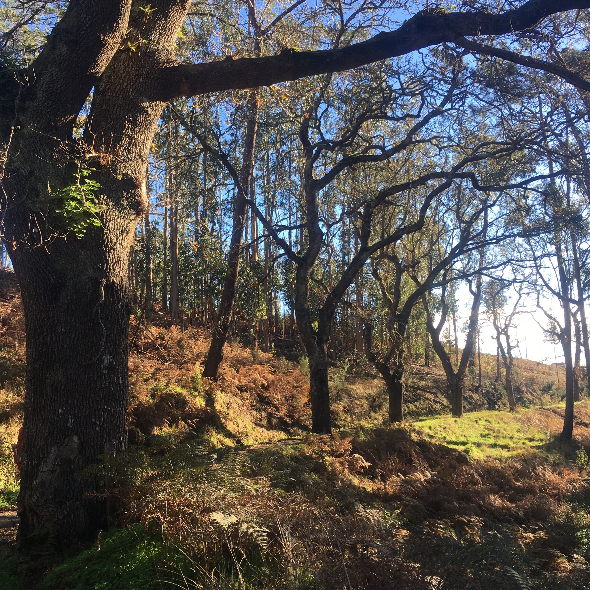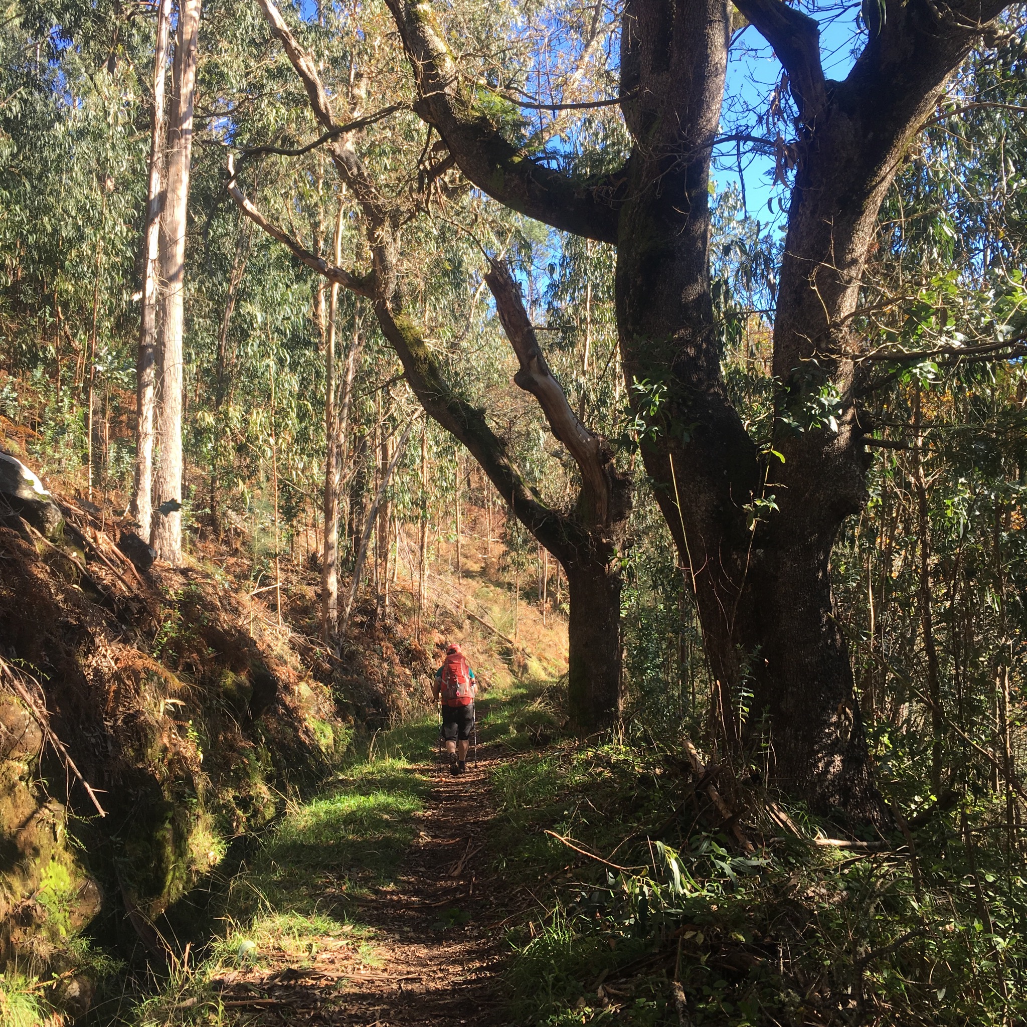 It wasn’t long before we were off again through the woods of oak, chestnut and eucalyptus which, in the dappled sunlight, reminded us strongly of hiking the Bibbulmen trail in Western Australia.