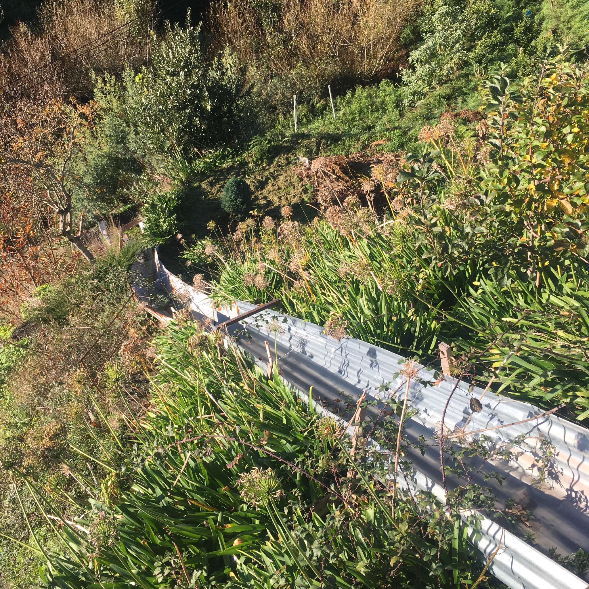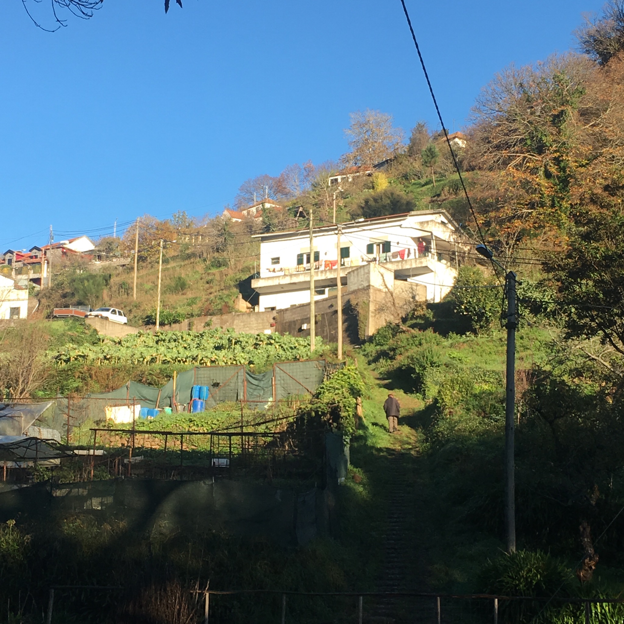 The levada was an old stone built one unlike the concrete of the Tornos but was dry as it made its way around the terraced valley before disappearing into a tunnel and leaving us to walk a quiet road for a few km through the little hamlet of Ribeiro Serrao. There were more ingenious aids to gardening on the steep slopes including corrugated iron slides and tyre terrace walls. No space was left untilled.