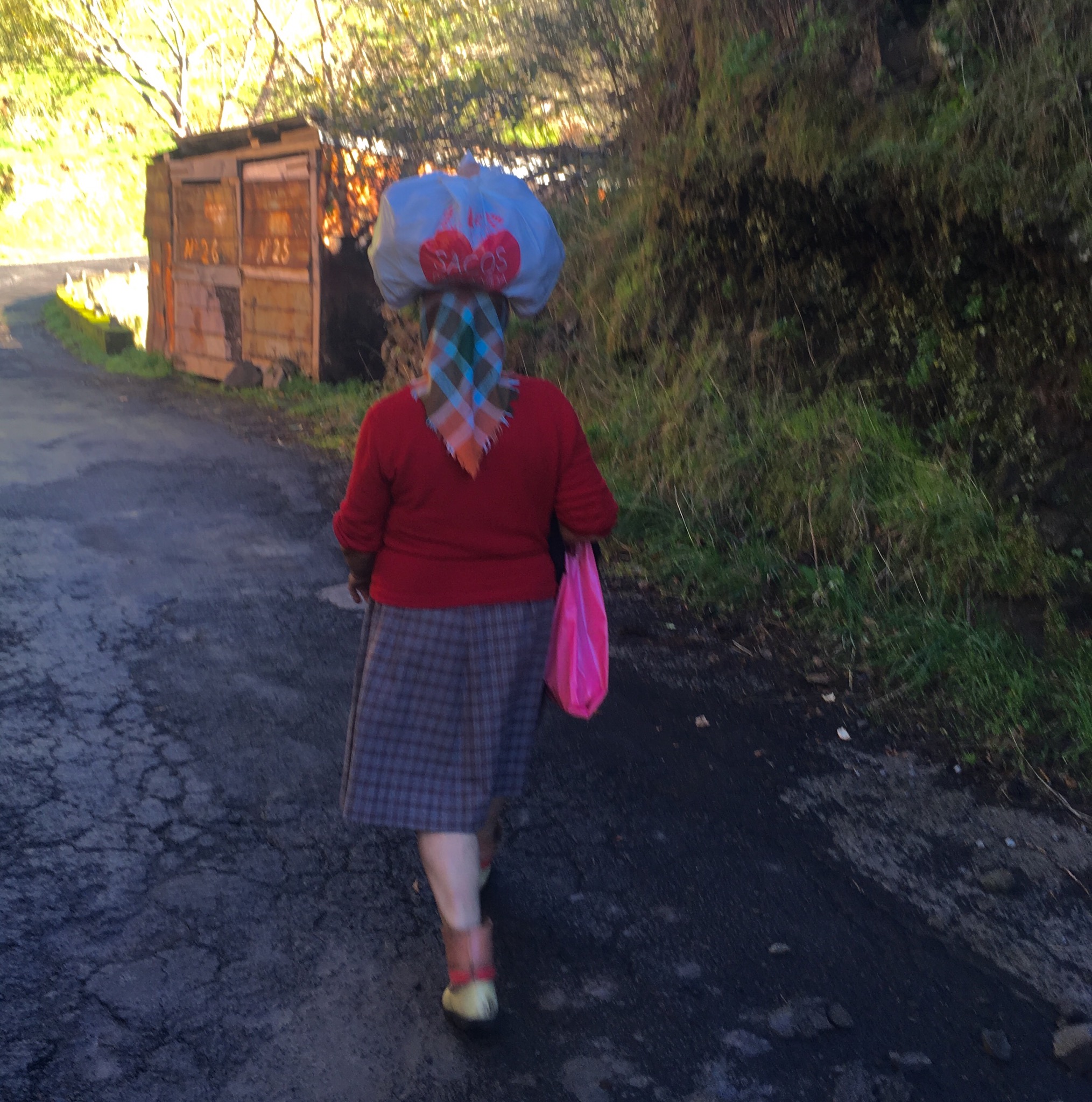 One house perched high above the road had an electric winch for hauling up the shopping and whatever and we were overtaken by an old lady carrying her shopping on her head.