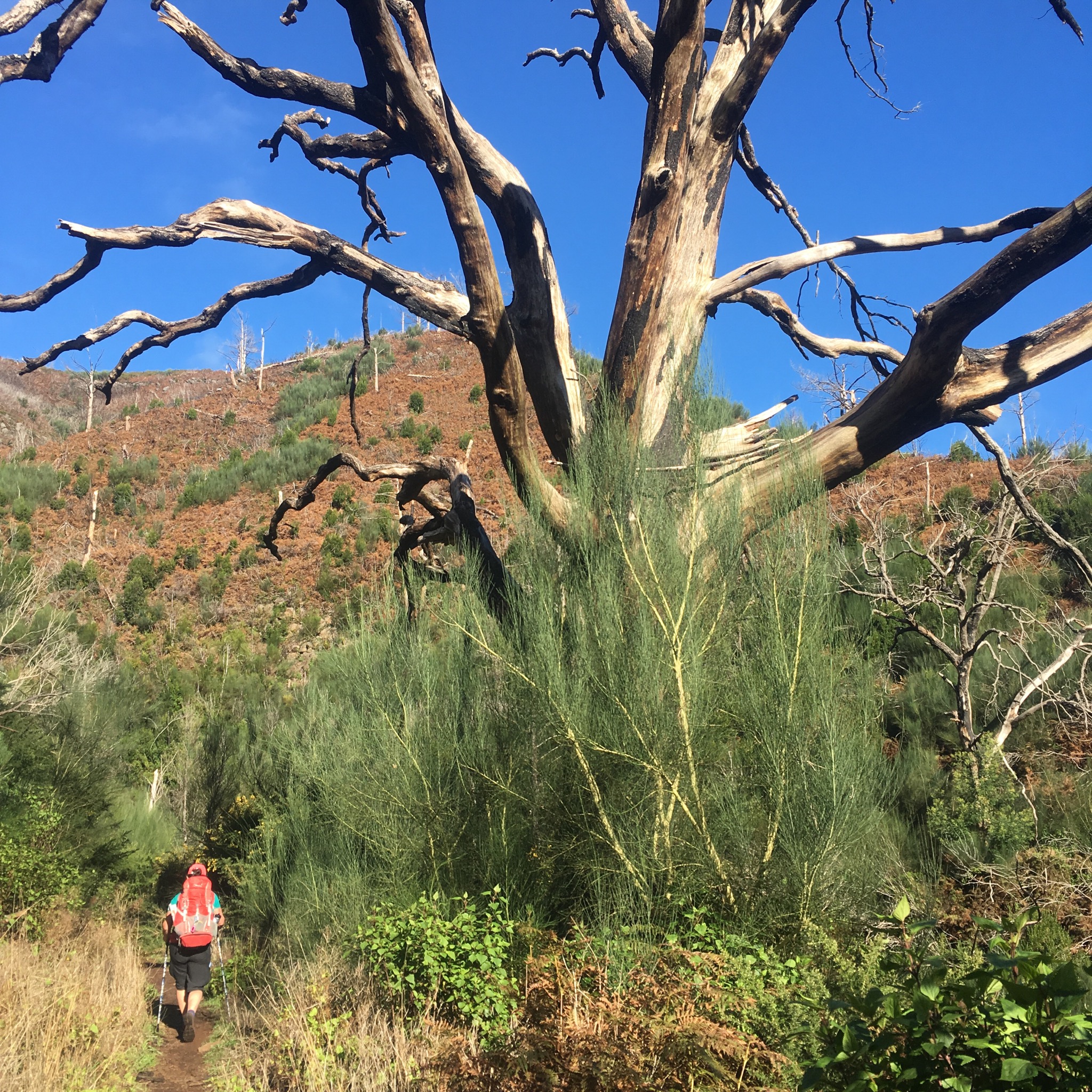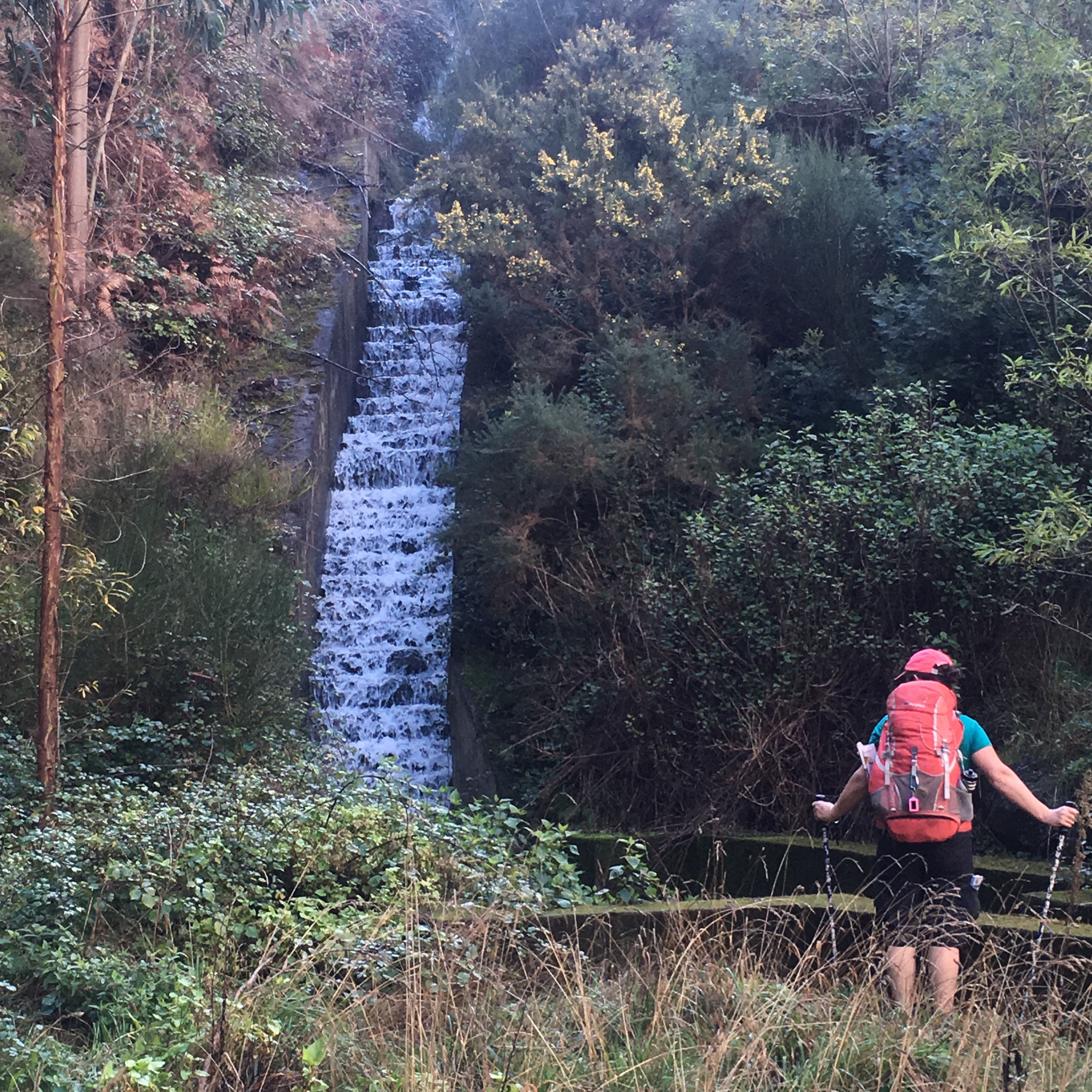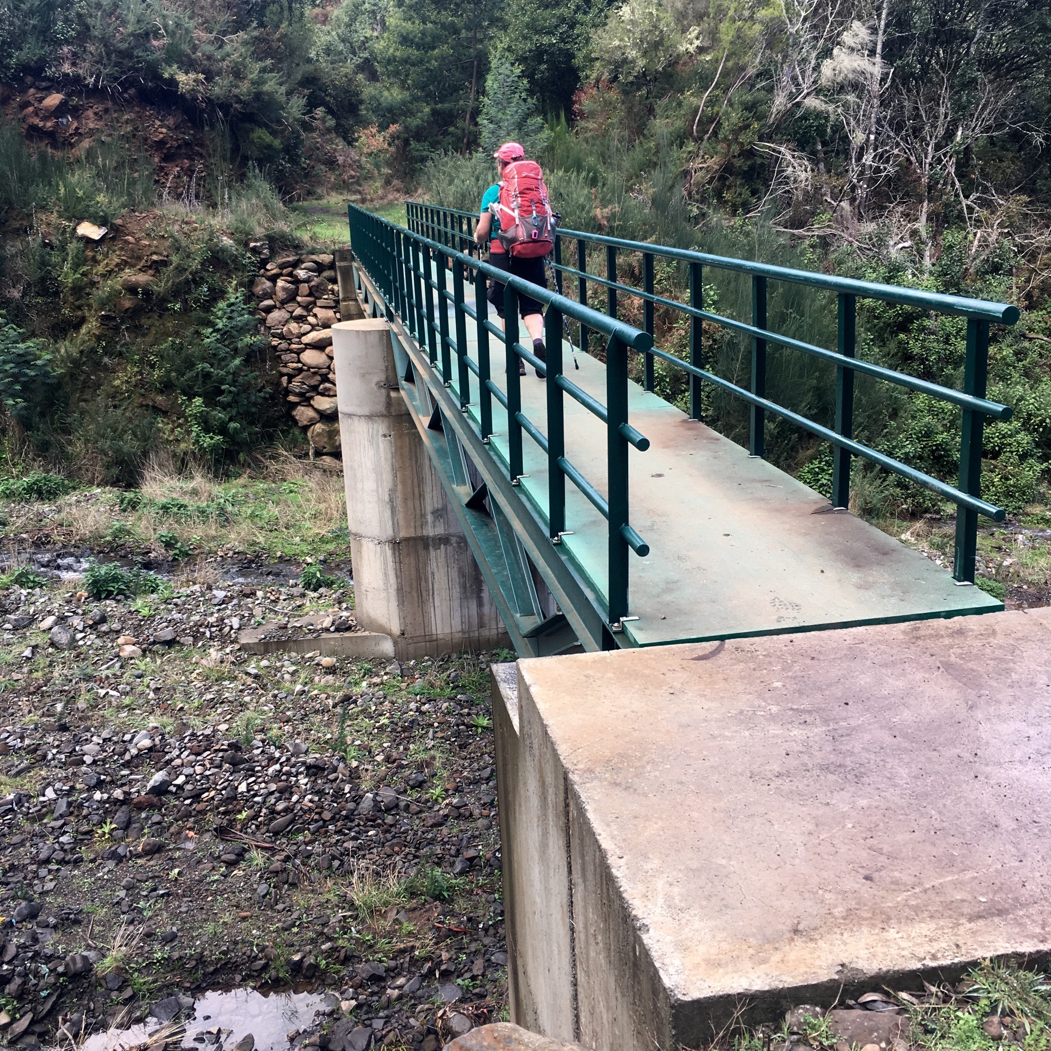 We had read that this was a very popular trail and to expect a crocodile line of walkers and we finally past a few coming up from Santo da Serra. The first fellow, who looked like he knew what he was doing with all his kit and his busy pace, turned out to be a Brit who had a b+b in Funchal and took out walking groups. He filled us in on the fires and as we walked over a new bridge explained that it had been put there after the devastating flood of 2010 had washed everything away.