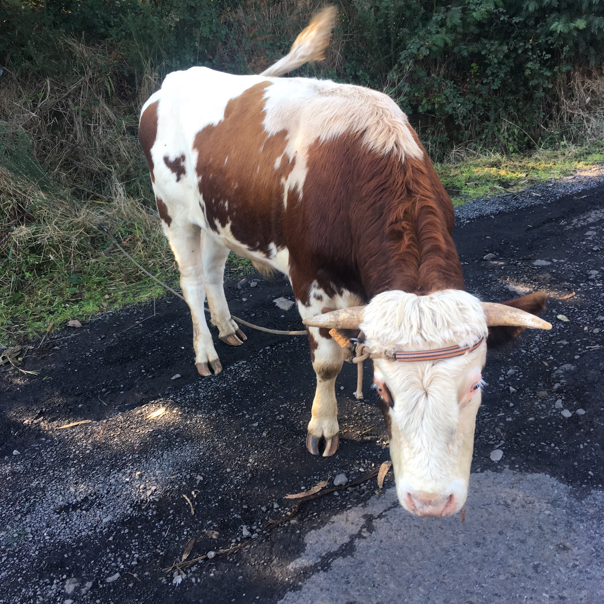 We left the levada at Lombo das Faias and went downhill on a track, past an unusual tea house/ trout fishing park and an unusual bull tied up by his headband.