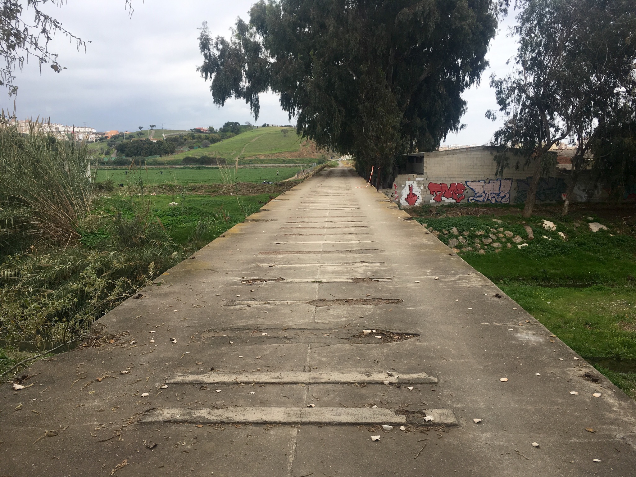 After a while I was back on the old railway line passing a station and bridge across the arroya before passing under the motorway, skirting an obscenely green golf course and more colourful chemical avocado plantations.
