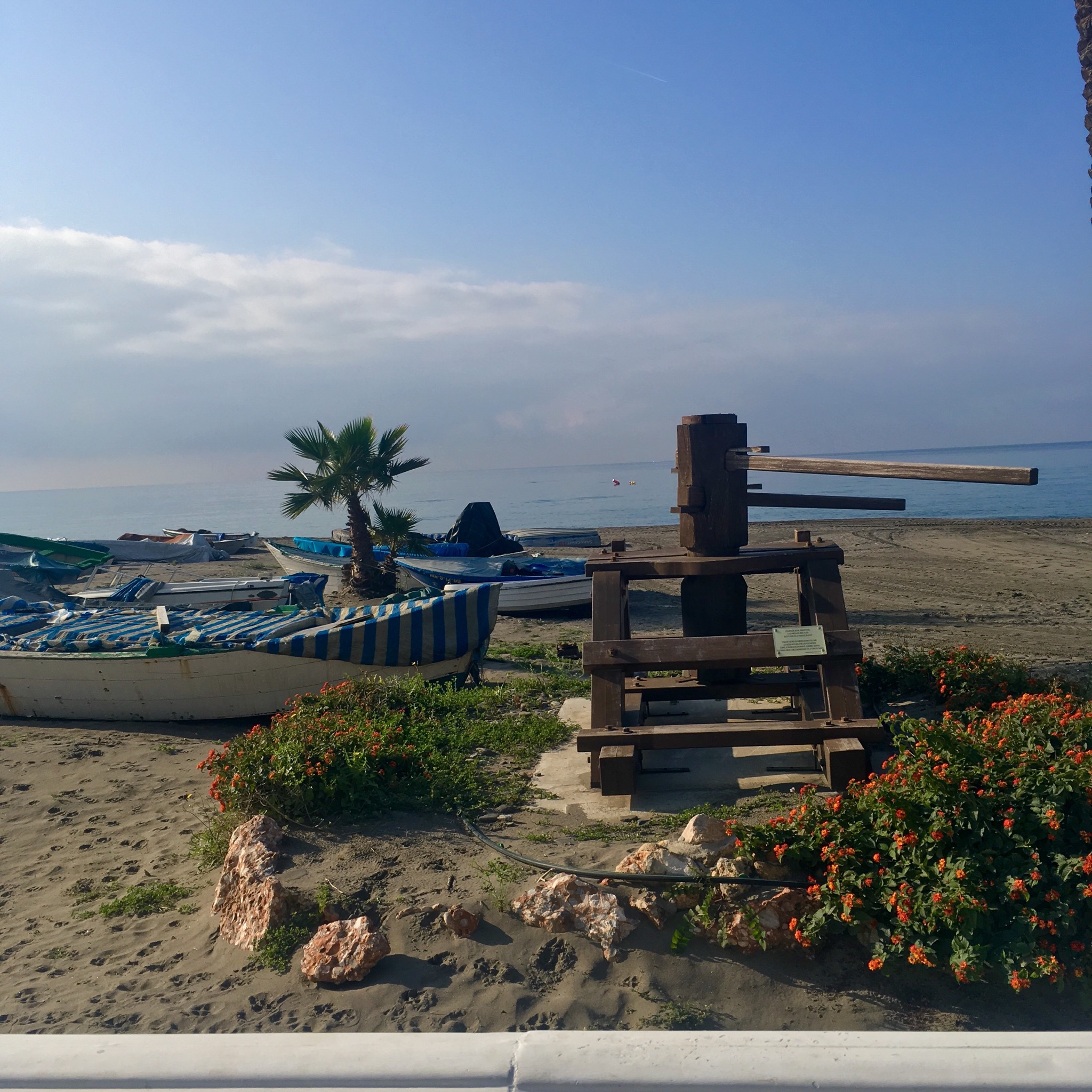 There were a series of fortified watch towers keeping an eye out for pirates and privateers along the coast and the route led me through patches of flowers and cactus past the winches used for hauling the boats out of the sea.