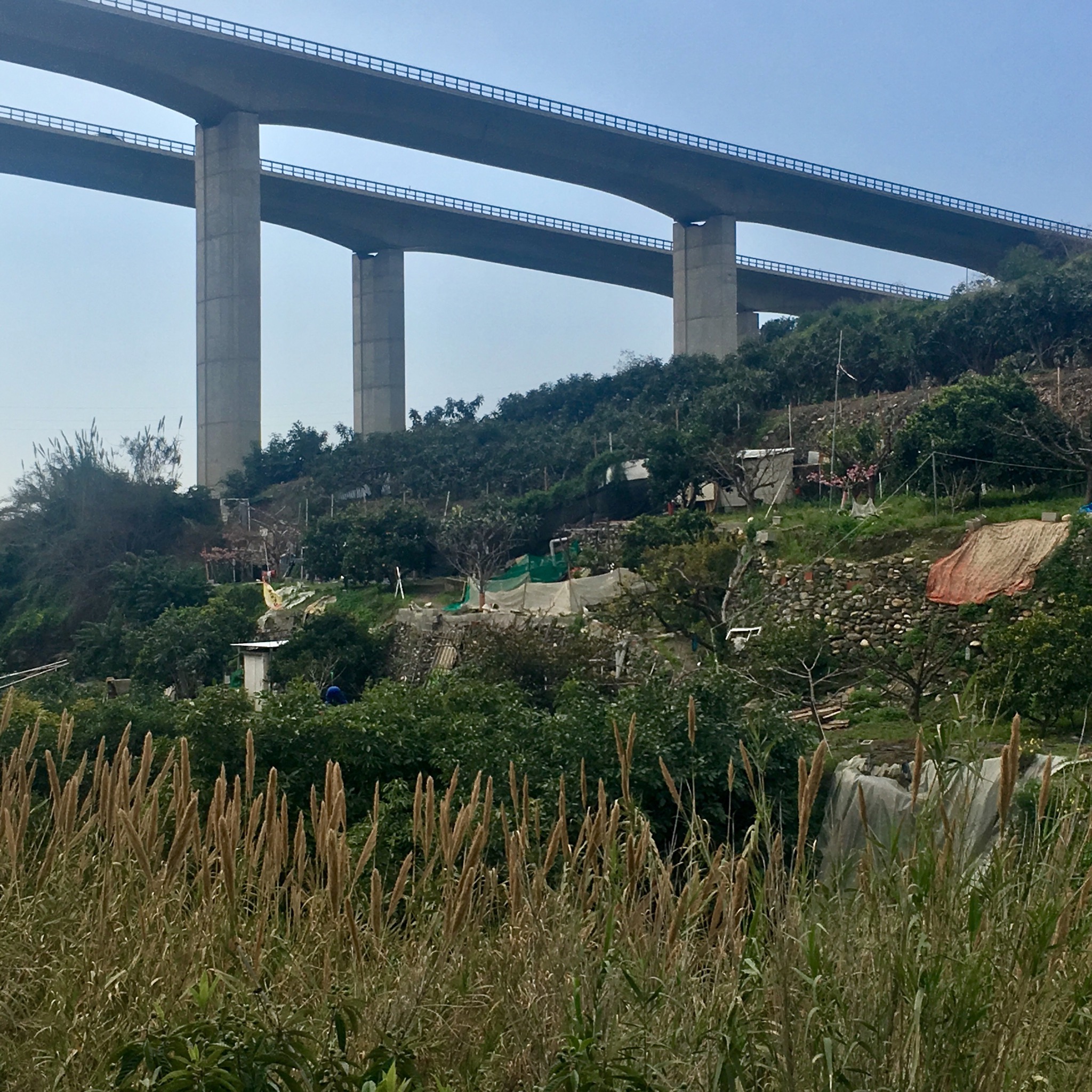 The vegetation was lush and small little subsistence farms plots were still tended in the shadow of the gigantic motorway structure, the slow movements of the gardener in contrast to the rushing traffic above.