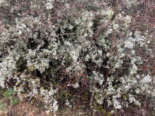 The flood waters looked like they had been about 2 m higher recently, judging by debris left high and dry in the bushes. The pines of earlier had merged into mostly juniper with hawthorn,willow, poplar and scrub of rose, gorse and spindle. The amount of lush and fulsome lichens was amazing both in the trees and on the forest floor amidst the euphorbia and hellebore.