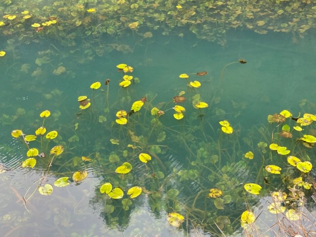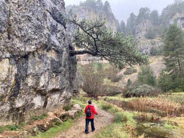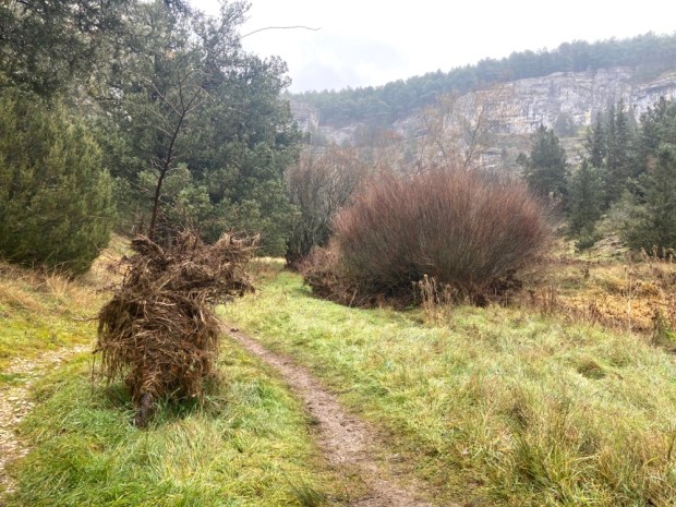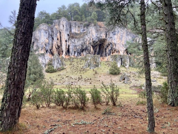 The gorge was fairly broad here with low cliffs of perforated limestone in the forest either side of the river that came and went above ground. Most of the Lobos is underground most of the time, sinking down through swallow holes before emerging again into pools of lily pads.