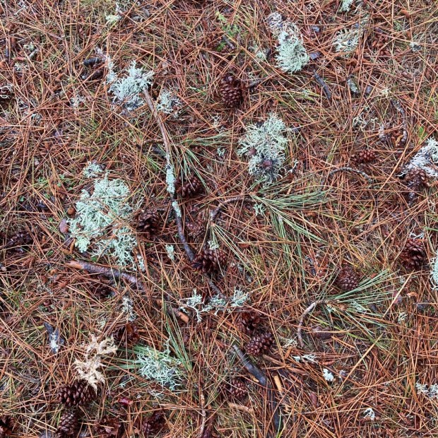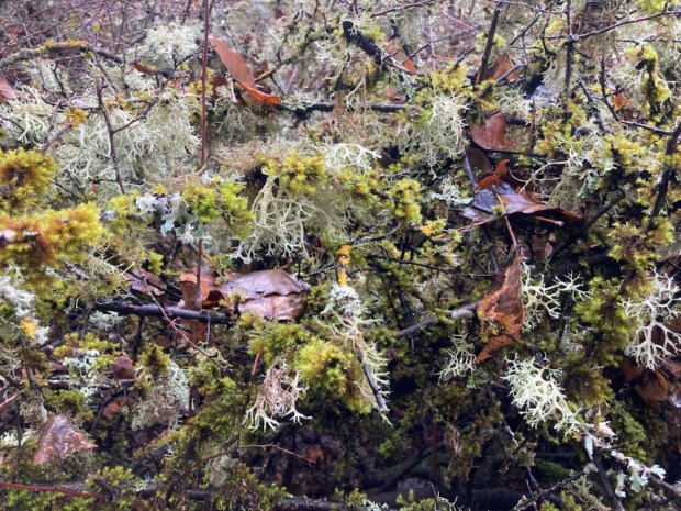 Setting off under a grey and misty sky we followed the signage down stream and into the mossy pine woods strung with lichens.
