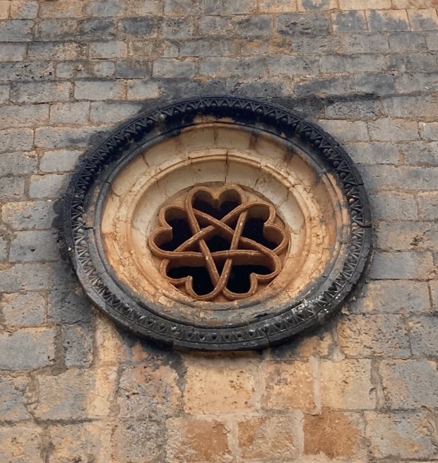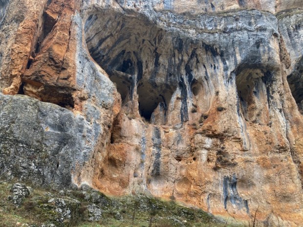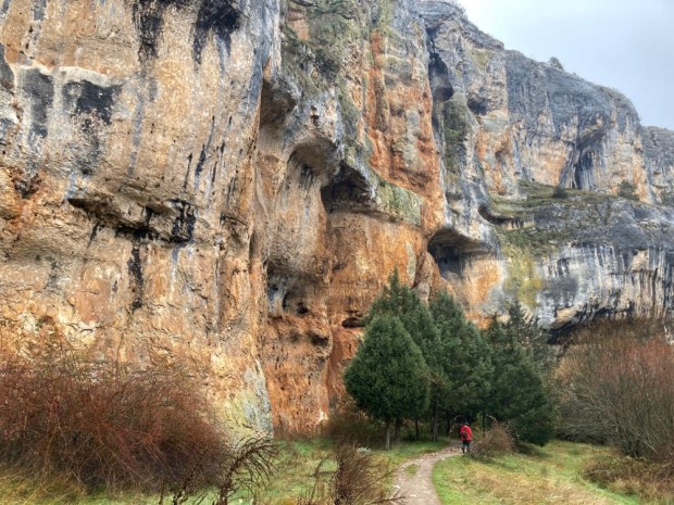 The track got busier as we approached the 12 th century chapel built by the Order of the Knights Templar. The major honey pot of the park and easily accessed from the southern end of the gorge it gets pretty crowed in summer. A spectacular setting to be sure and an attractive building with fine rose windows and corbelled doorway. Opposite is a huge cave where Iron Age engravings and earlier art have been found.
