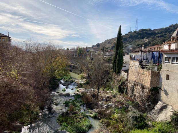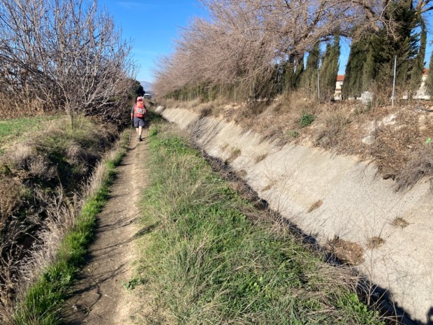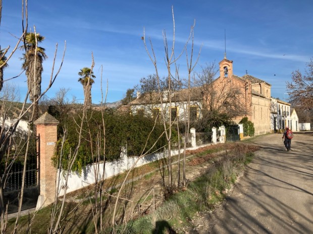 At one point the route was blocked by drainage works and a young jobsworth tried to stop our progress before an old hand, seeing we were peregrinos, led us through towards Santiago. The power of the pilgrim! Looking back the snow covered Sierra Nevada slowly shrank as we walked beside deep irrigation channels of pretty foul smelling water and, after Atarfe and its monumental roundabout sculptures, beside the high speed railway line to Seville. We clambered up an embankment and entered Pinos Puente after 20km and 4 1/2 hrs walking. Not too bad for first day.