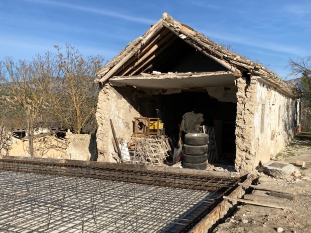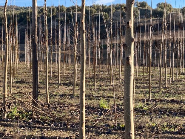 At last in open hilly countryside, but still on the road, we passed a ruined drying shed ( but had no idea what might be dried ) and poplar plantations , freshly pruned, growing alongside a river that offered the chance to swim in old mill ponds and natural rock pools – a bit cold today though with frost on the shadowed ground.