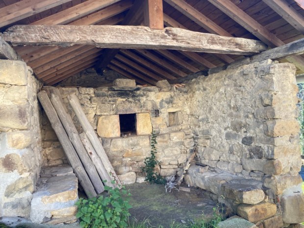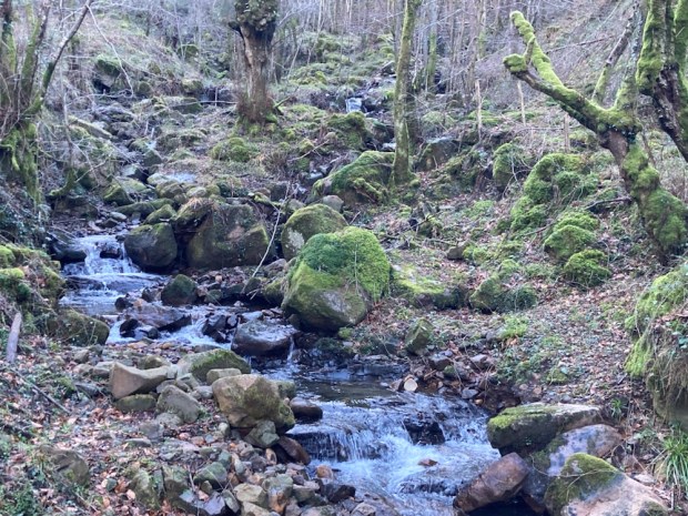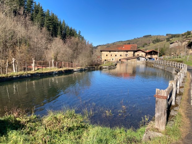 In the little traditional hamlet of Usabel we followed the road past the mill pond of a former forge and , later, hydroelectric turbine and the adjoining 16th c farmhouse. The traditional 3 storey farmhouses of this area were built to house livestock and workshops on the ground floor, hay and corn on the top and domestic living was sandwiched, insulated, between the two.