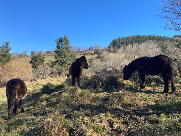 Climbing up a narrow lane way and along a field side path we entered some coppice woodland and herds of stocky horses similar to a breed we’d seen raised for meat.