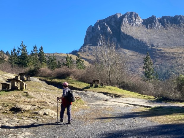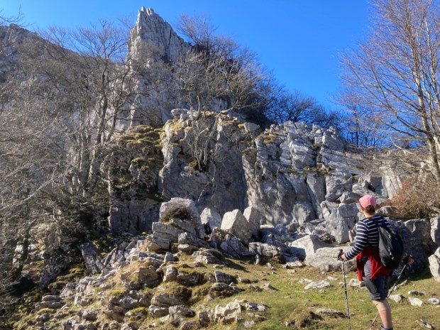 Leaving the area recreativa in the early morning sun we started to climb a well worn path up through the forest and out onto more open pasture where, as wide ranging views opened towards the Pyrenees, the Ojo de Atxular ( Eye of Atxular) peered down at us from the rocky crest.