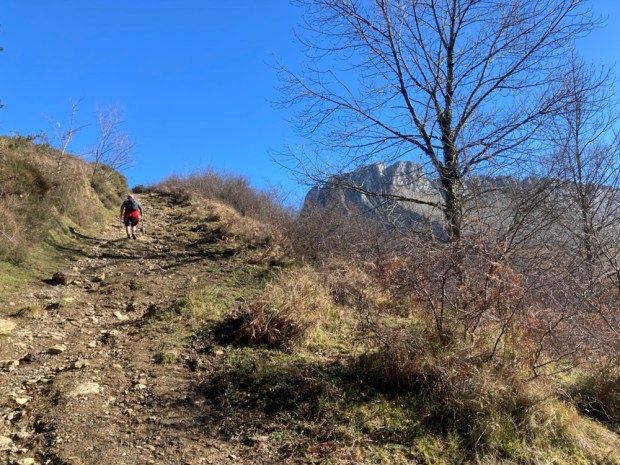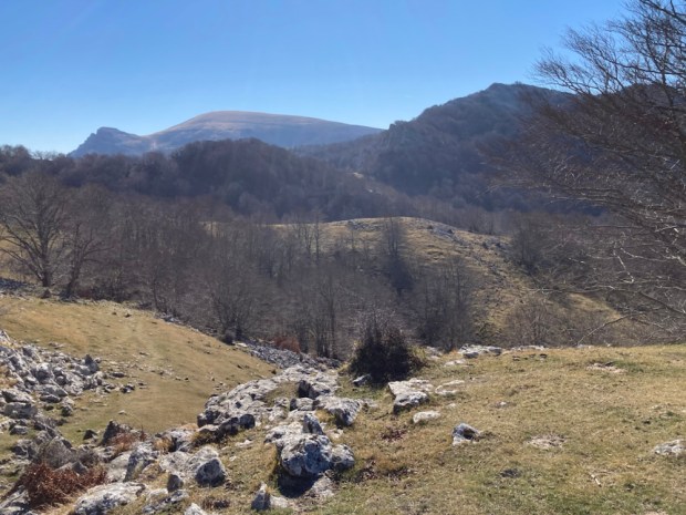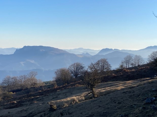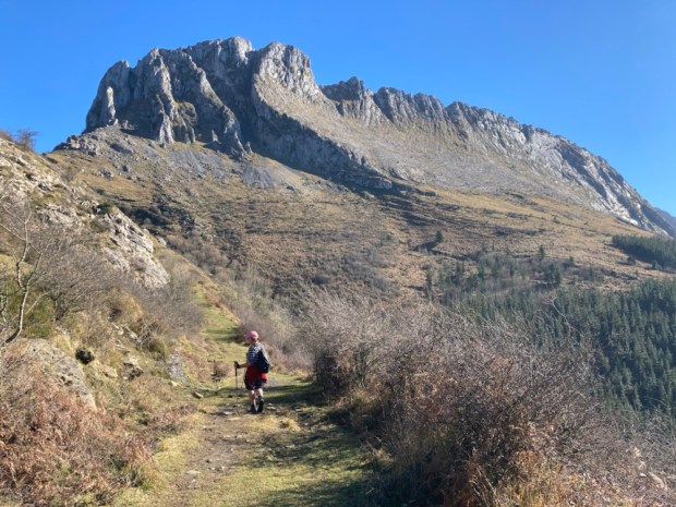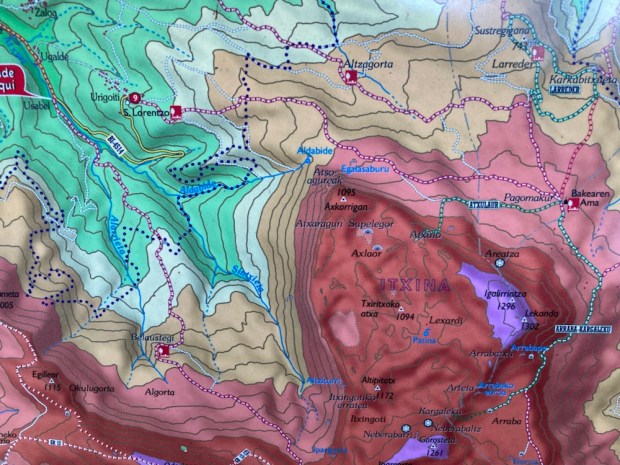 Climbing out of the village slowly the conifer forest gave way to more open mountain side affording wide views back towards the coast with the imposing hulk of the Itxina massif rearing up above us as we ascended through beech woods and rough tracks to the Aldabide waterfall.