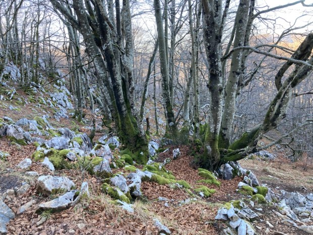 This popular iconic route would take us up through a spectacular natural stone arch at about 1000m and into the bizarre karst formations, 500 sinkholes , mysterious caves, hidden upland meadows and sacred beech groves of the magical world of the Itxina protected biotope.