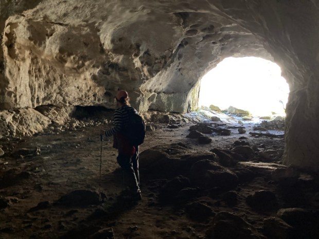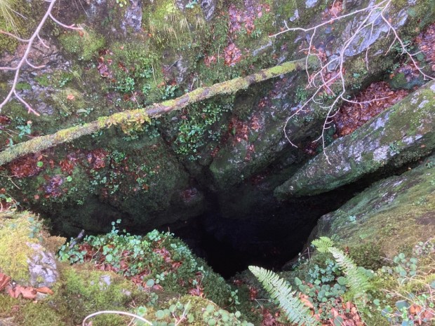 We followed a spur trail through the labyrinth of sinkholes surrounded by cracked and fissured limestone like the scattered artworks of a prodigious sculptor. A faint path, sporadic splashes of paint and numerous cairns of stacked stones led us up and down through the mossy maze to the gaping mouth of Supelegor Cave.
