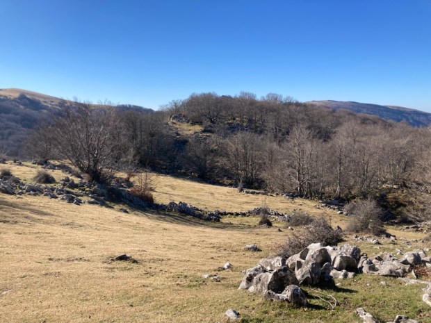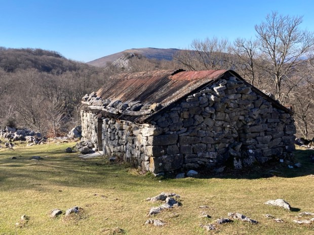 After clambering back towards the Eye of Atxular we headed onwards eventually reaching more open ground with views of the plateau and then beautiful Alpine like meadows with the crumbling remains of one shepherds hut and the more welcoming refuge of another. The weather can quickly get bad here and I can imagine this shelter amidst the labyrinth has saved lives in the snow.