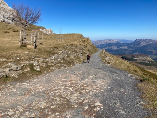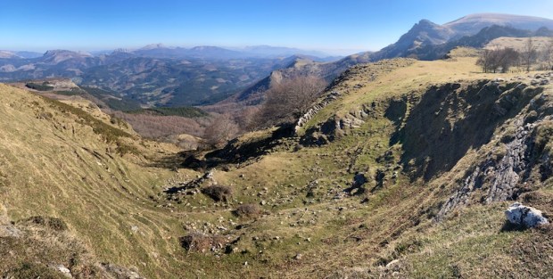 Continuing to the southern end of the massif we got views of the swollen dome of Gorbeia itself, the highest in the region at 1480m, before dropping down through the pass at the sheer cliffs of Arrabako Ate and out onto the vast grassy plateau of Arraba.