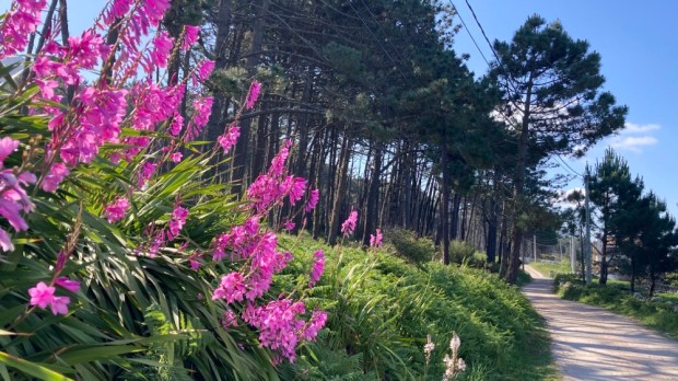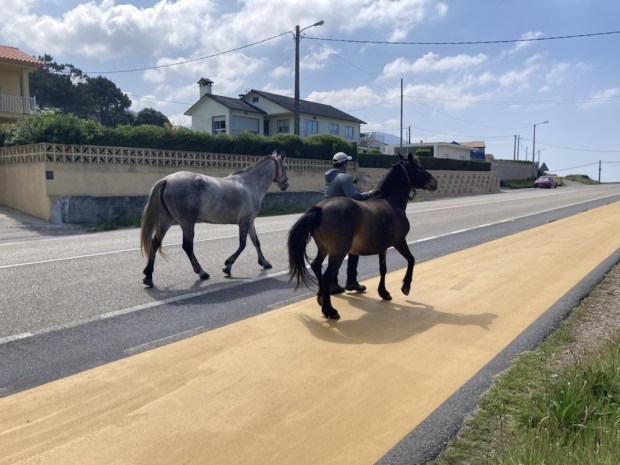 It was all very much like a sunny south Connemara with tiny strips of land separated by granite stone walls. After a while I had to leave the coast and climb up to join a sandy track that led to the main road and a yellow strip of cycleway I had to suffer for a while on and off as it alternated with dirt tracks lined with enough broom to ward off any lingering evil.