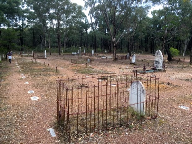 Exploring the remnants of the gold rush days further we set off on a 30km length of dirt track to the scene of once frenzied activity in the ghost town of Whroo. In 1854 a couple of guys kicked a big nugget of gold out of the grass here and began a rush that saw a town of 13o buildings and a tent town grow up in the highly profitable decades that followed. Nothing now remains except mounds of disturbed soil, some cyanide vats which were used to separate the gold from quartz and the sad and isolated graveyard containing the graves of some 400 men, women and children who died at the mines.