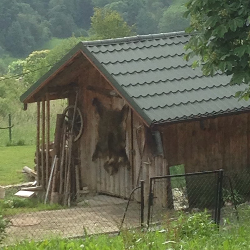 It’s a pretty wild area with forests as far as the eye can see and the first thing we come across is a bearskin drying on a shed door.