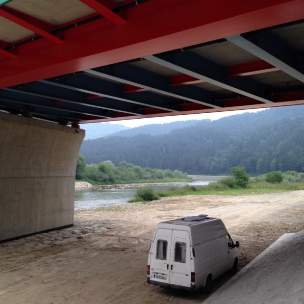 With a thunderstorm forecast and the dog and park situation being a bit of a hassle we decided to abandon Poland and head for the border. We parked up for the night by the Popradzki river under the new bridge for protection from the storm.