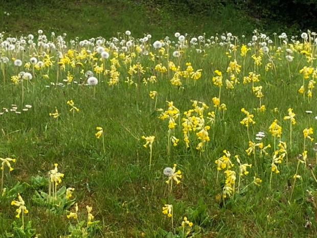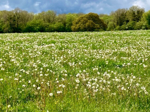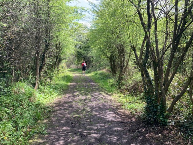 A stretch of tarmac road took us passed a railway cottage virtually on the line and on to a track of esker gravel that wove between dandelion laden fields and into Doorey Woods.