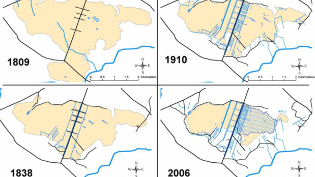 The turf extraction industries of the past had left less than 50% of the original bog surface remaining and maps of the changes over 200 years show the increases in tracks and drains.