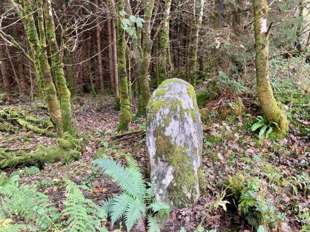 A large standing stone and a stone alignment atop a gravel ridge had a very different prospect before the trees surrounded them. It is conjectured that the stone row is in alignment with Nephin on the winter Soltice when the sun would appear to “roll” down its shoulder, similar to an event we have witnessed on Croagh Patrick.