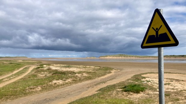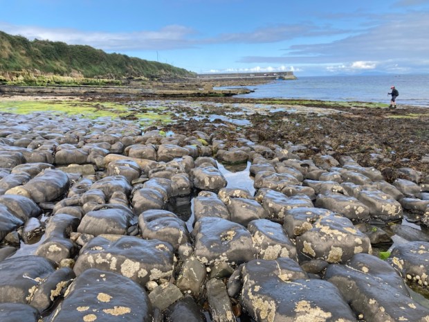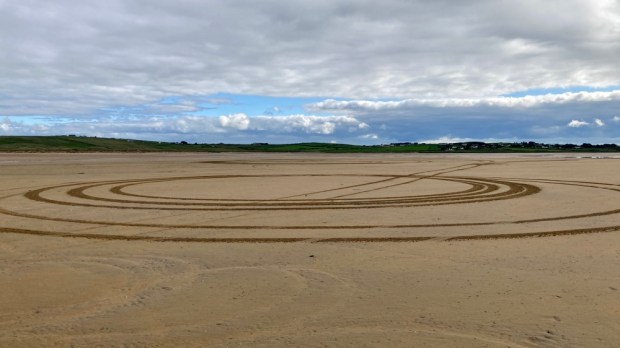 A coffee at the beach watching kayakers setting off for a fisheye view of the cliff divers, and we drove east over the headland for our last walking environment- the shore. The tide was out on Lacken Bay exposing miles of golden sands. There is a centuries old tradition of horse racing on the strand and every May thoroughbreds from around the country compete over a 5 furlong looped track surrounded by spectators who also engage in a variety of family fun sporting activities. Rather than sleek steeds racing around the sand we had to endure a boy racer doing doughnuts.