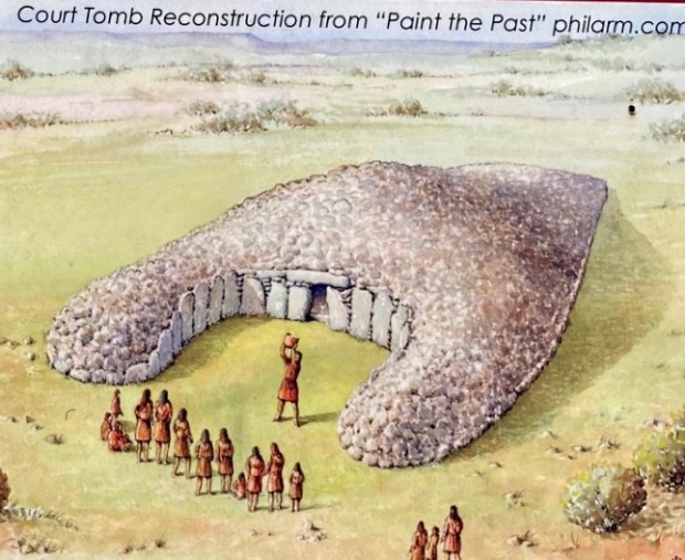 Although surveyed in the early 1960’s, when the state forestry board first bought and planted the land, the pre-bog boundary walls, field systems, court- tombs, stone row and standing stone here were “lost” for decades before being brought to light in ‘ 93 by a couple of archaeology students. Since then the local community has done much to preserve and present these remnants of Ireland’s first farmers over 5000 years ago.