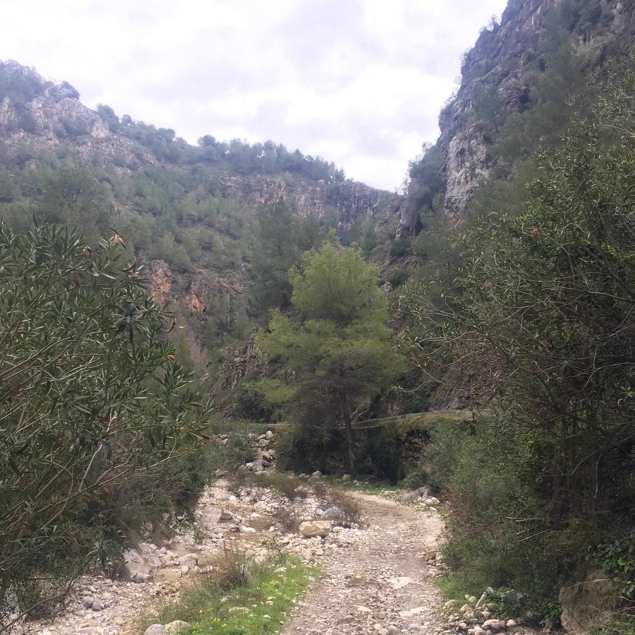 I passed by some of the caves in the riverbed below me, occasionally occupied by nature loving hippy types of which I saw no sign. The mountain slopes were filled with Alleppo pine, box, broom, juniper,fan palms and assorted and unknown to me, flowers.