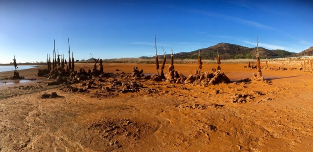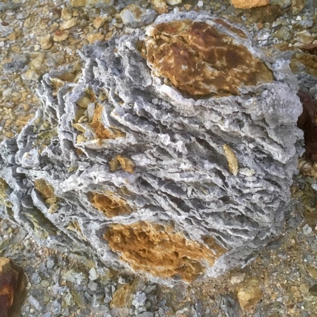 Water levels were low, revealing strange mineral encrusted life forms. Trunks and branches of long dead trees and stalks of amazingly surviving reeds were coated thickly in ? And the orange mud surrounding them was worryingly quicksand like. Not a way I’d wanna go.