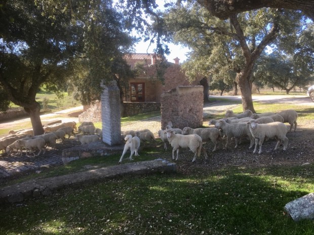Arriving at Aldea del Cerezo after 7 or so km we had a little refreshment break and watched dogs, farmer in Jeep and wife on foot struggle in control a flock of errant sheep.
