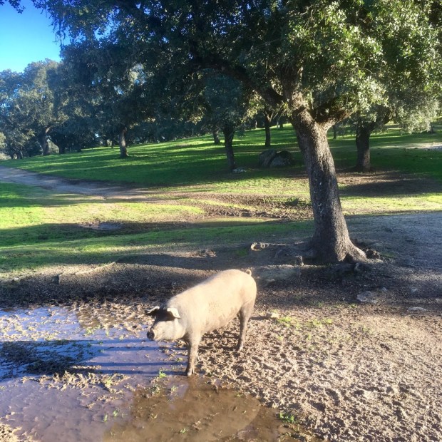 Nearing the end of our walk we passed a load of pigs leading a lifestyle a lot more restricted. I’m not sure if these were those grain fed farm reared pigs that obtain “Cebo” status or what but “Bellota” is a happy pig.