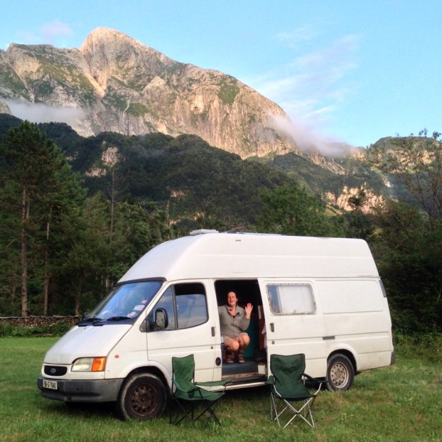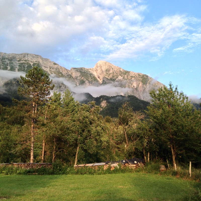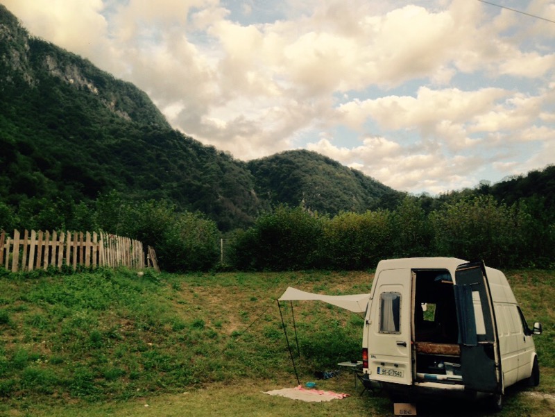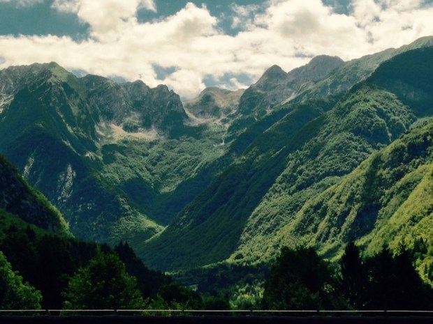 On the valley floor we skirted the mountains round to Kobarid and pitched up on an Eco Camping site, Kamp Koren. Basically one that is inspected to come up to certain criteria of greenness or greenwash. This one had the solar this and that and energy saving how’s yer fathers and some goats rabbits and veg garden. And the views were good.