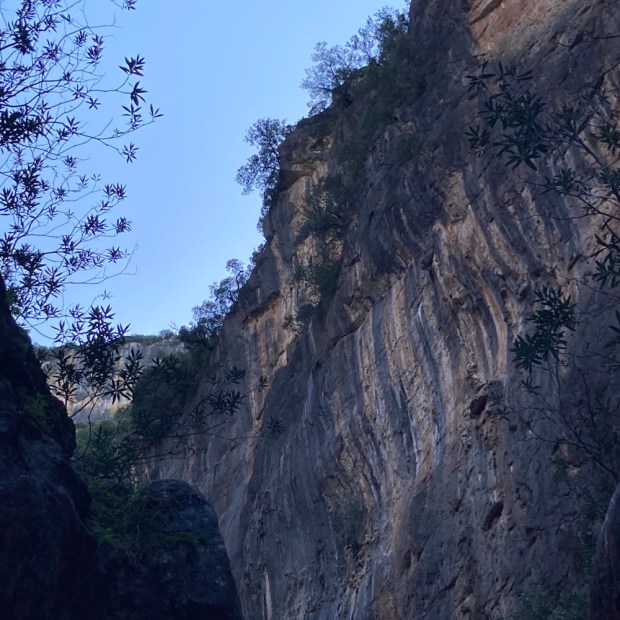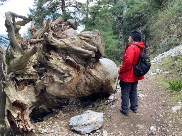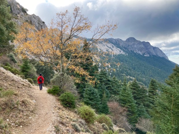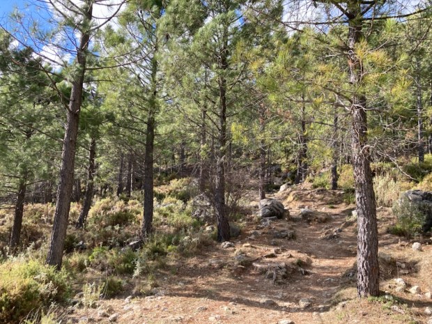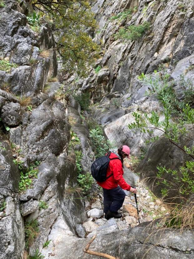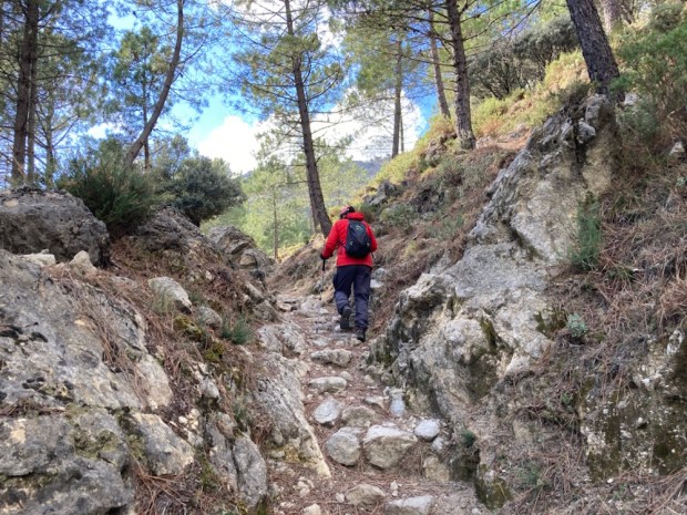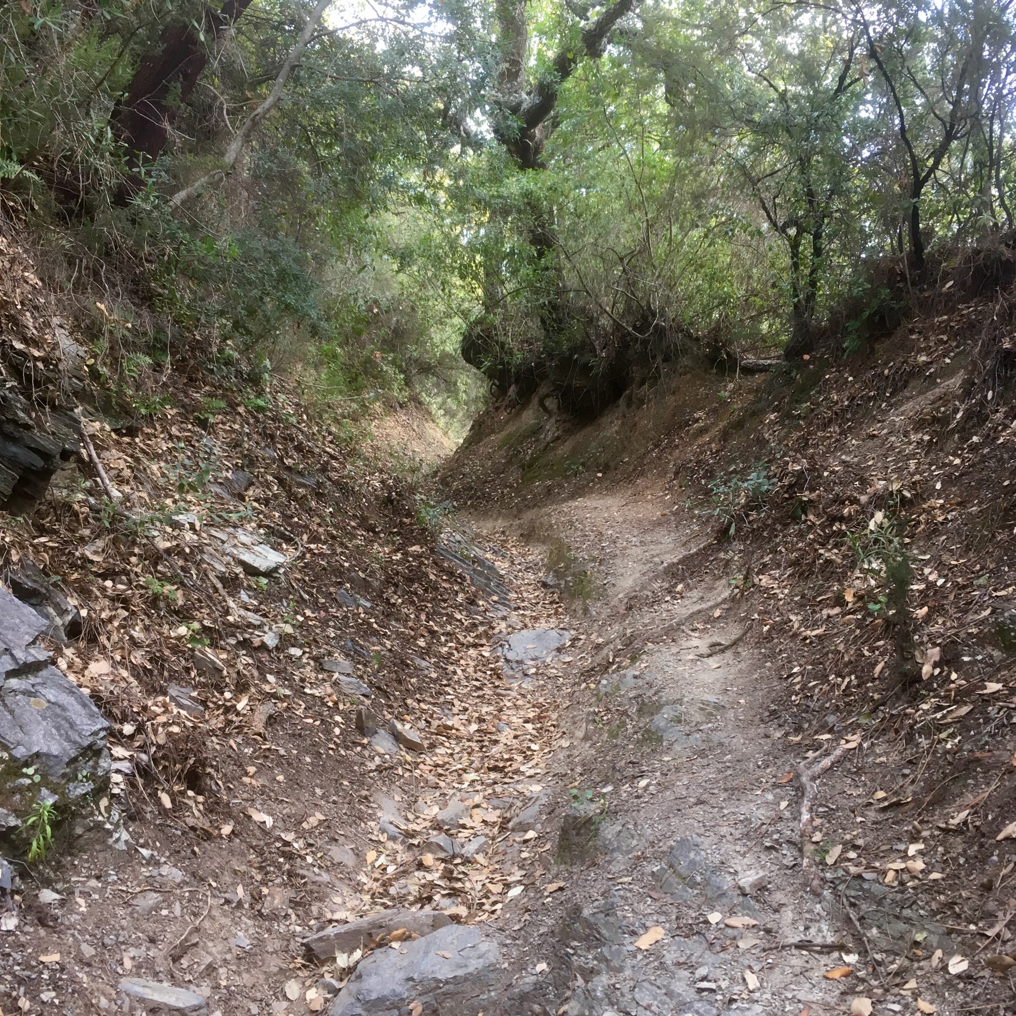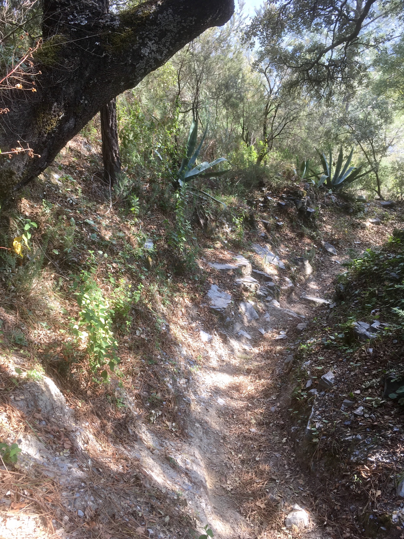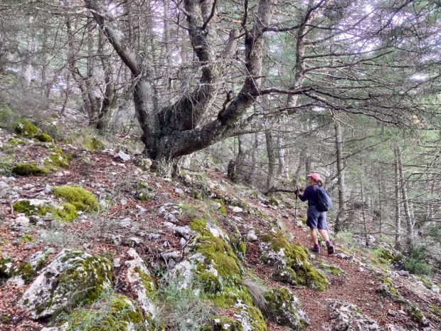 First few Kms were a rocky scramble up a dry stream bed and on a lovely path through a forest of pine with distinctive peaks rising above us. As the sun climbed and the heat rose so did the strong scents of pine needles and oil and I recalled the studies of the positive effects on the mental and physical health of “forest bathing” and the phytoncides, the chemicals emitted by the trees.
