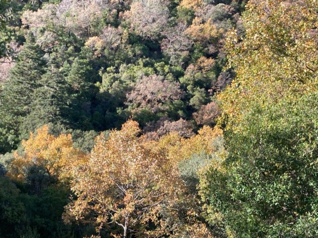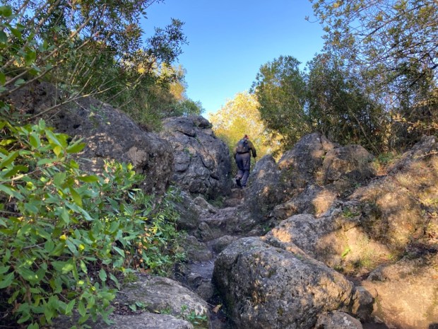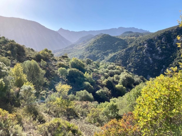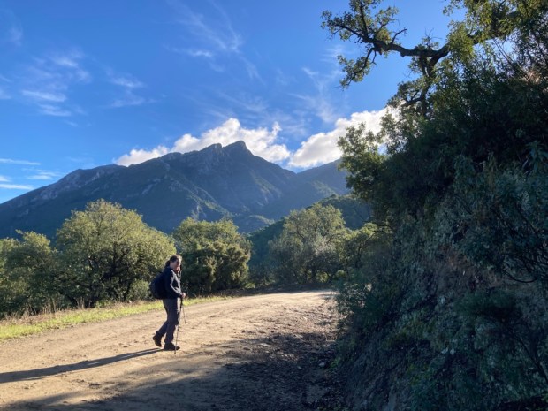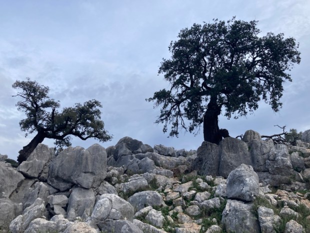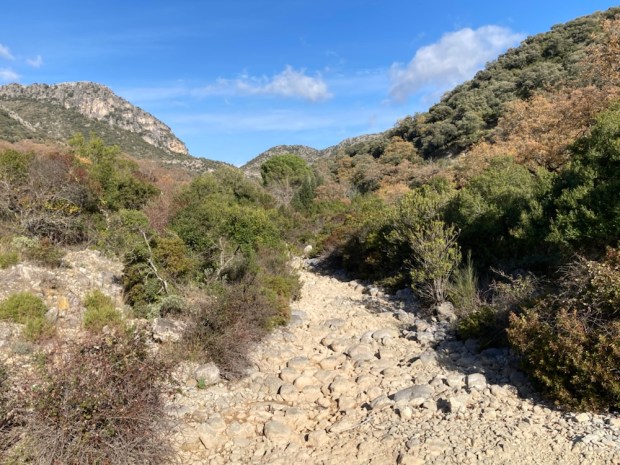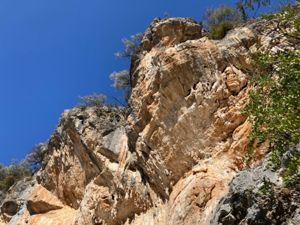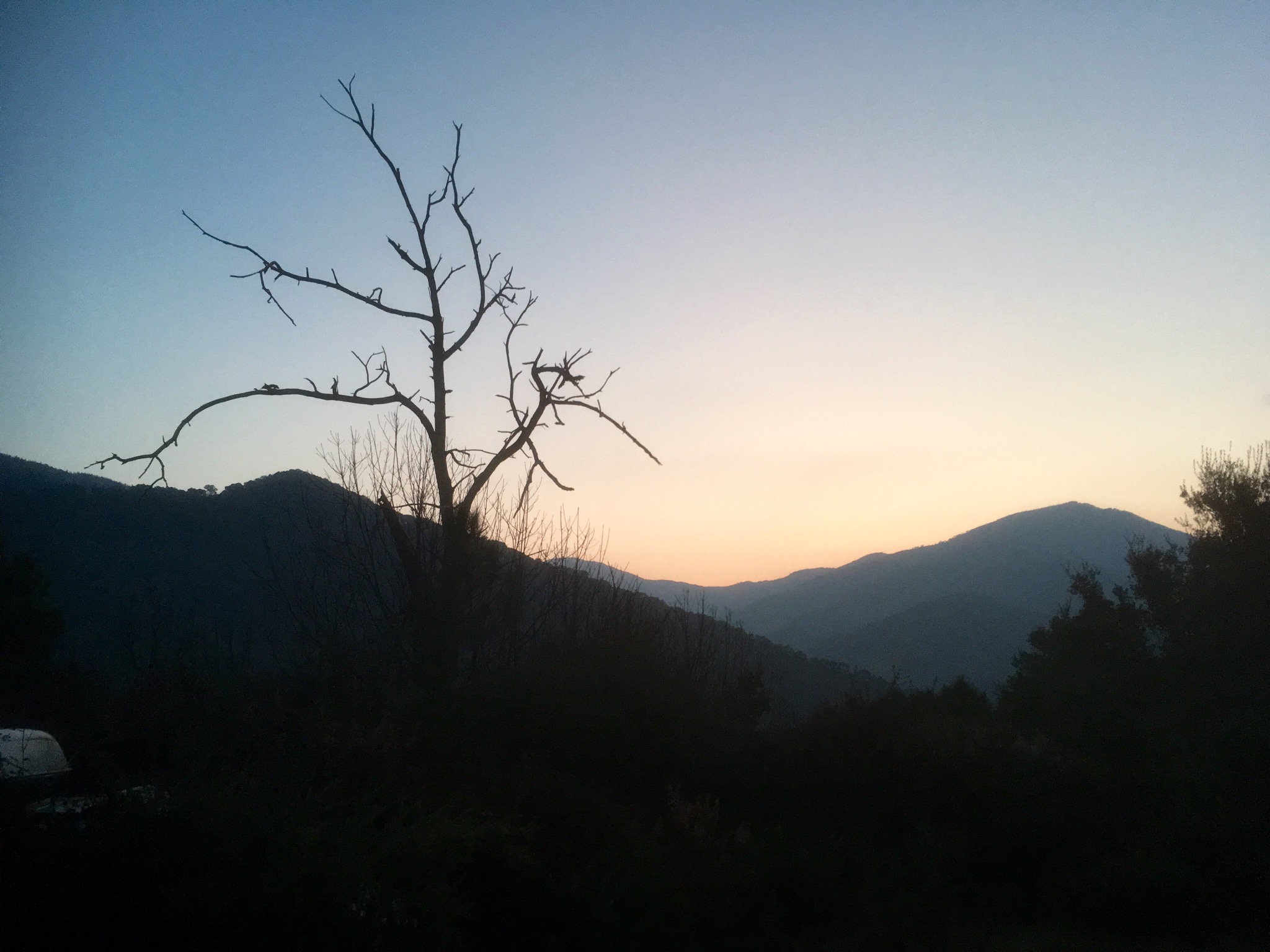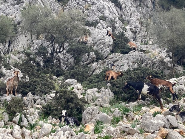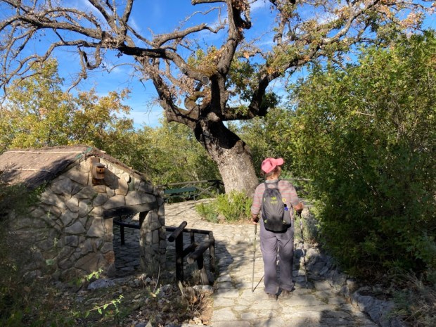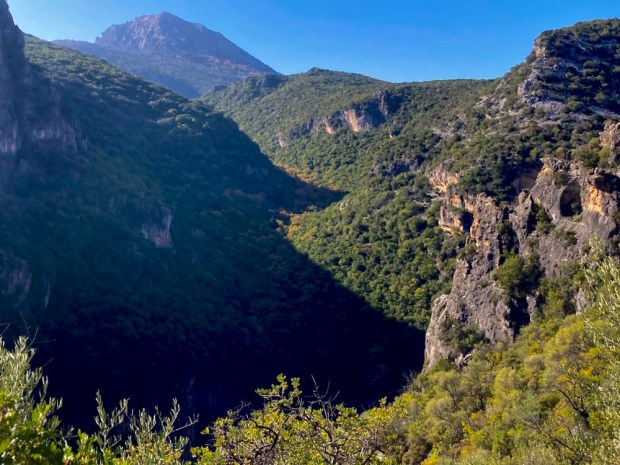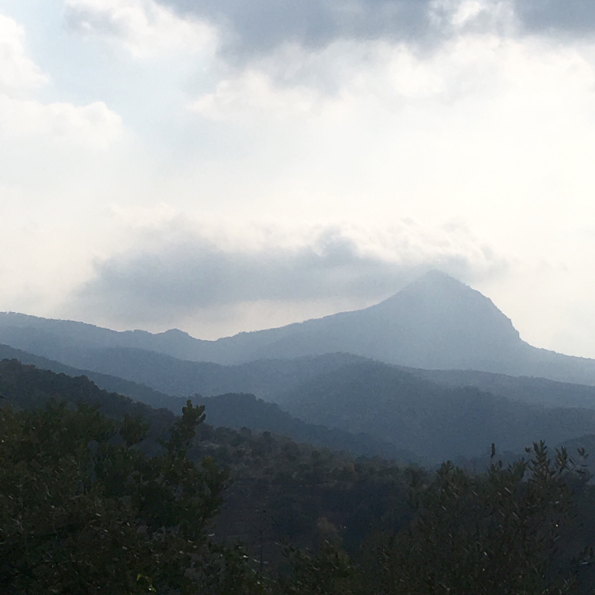 First few Kms were a rocky scramble up a dry stream bed and on a lovely path through a forest of pine with distinctive peaks rising above us. As the sun climbed and the heat rose so did the strong scents of pine needles and oil and I recalled the studies of the positive effects on the mental and physical health of “forest bathing” and the phytoncides, the chemicals emitted by the trees.