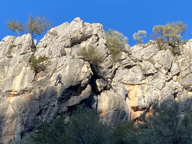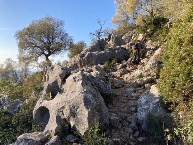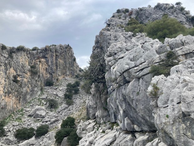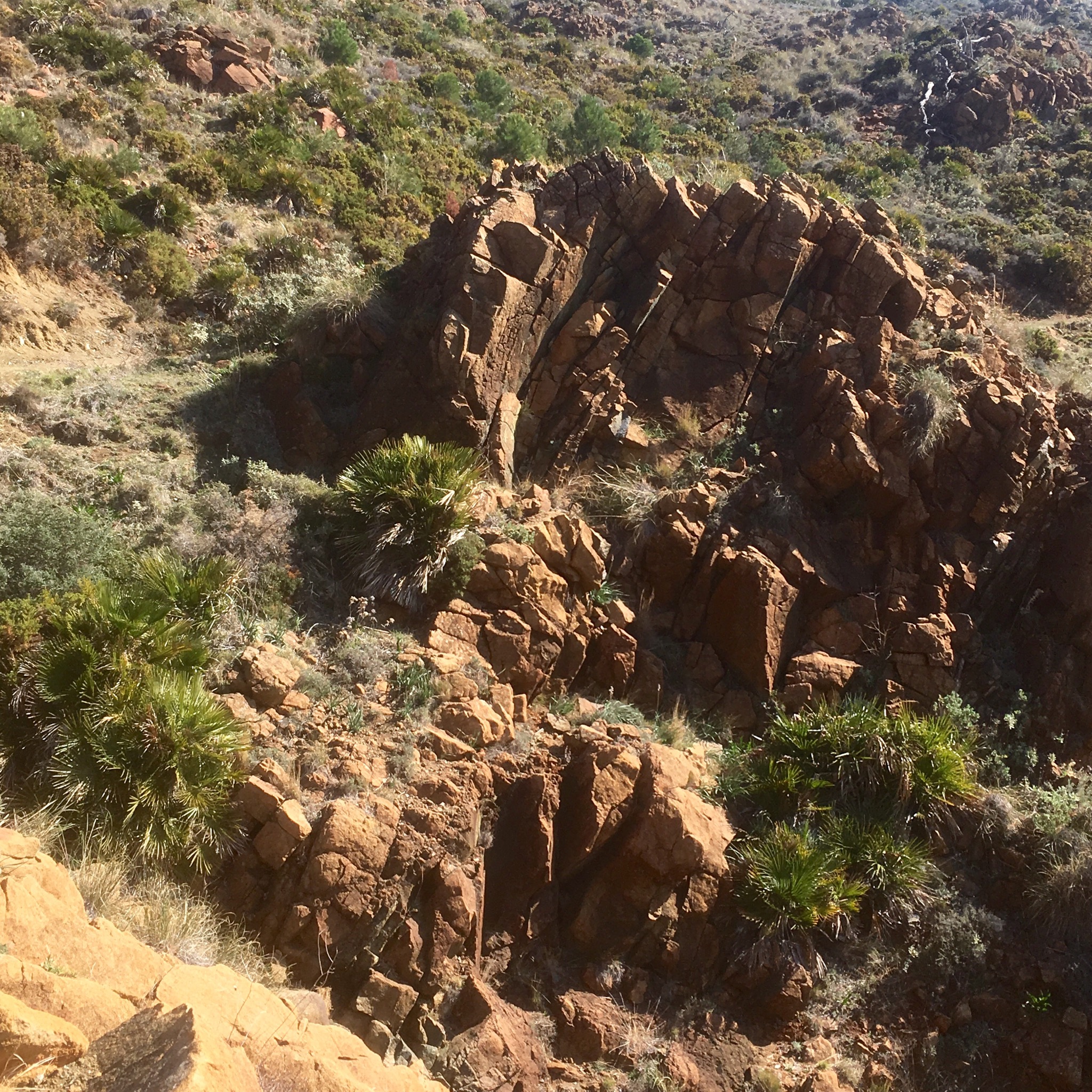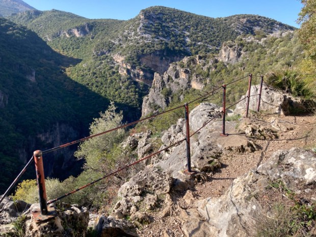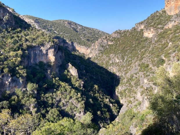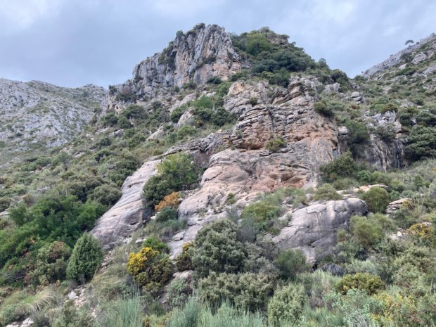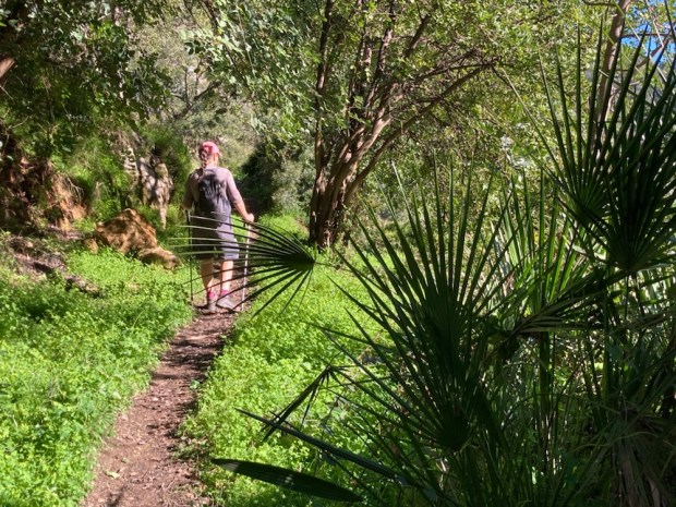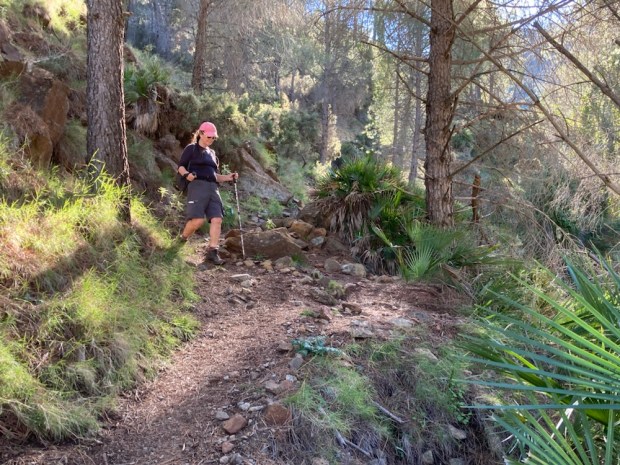 We had passed signs warning us that our route demanded physical fitness, good mountain orienteering skills and experience and we began to see why when we started to clamber down the descent towards Istan on a, luckily dry, stream bed, the Canada de Juan Ingles gorge. Tricky going but rewarded by the magnificent views and flora, particularly the dwarf or fan palms and the masses of aromatic rosemary, thyme and lavender.