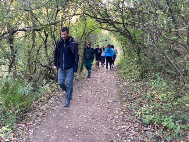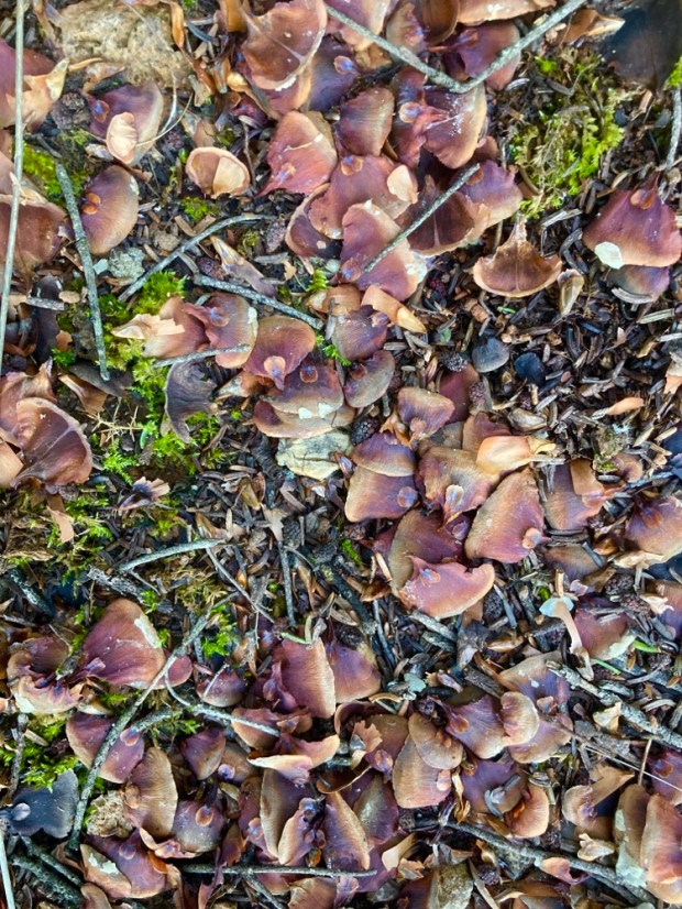 Emerging onto a forestry track on a high level plain planted with a variety of conifers and eucalyptus we passed a number of weekend walkers and a few parties of mushroom gatherers- all of whom had dogs that made us wonder if they used them to sniff out the fungi. They seemed to have been successful anyway and had baskets brimming with a mushroom similar to chanterelles that we were told bled red juice when cut with a knife.