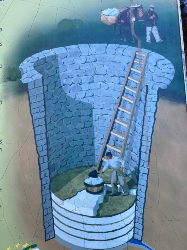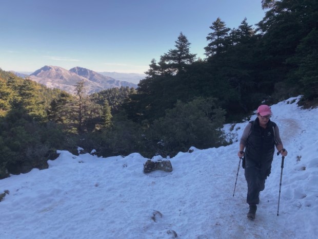 After a chocolate break on reaching the mirador at 1240m we set off on a yellow and white marked route the PR-A 351 and were immediately immersed into the snowy landscape that had long been a source of industry with the building of snow pits and the subsequent transportation ,by mule ,of snow and ice all over the province.