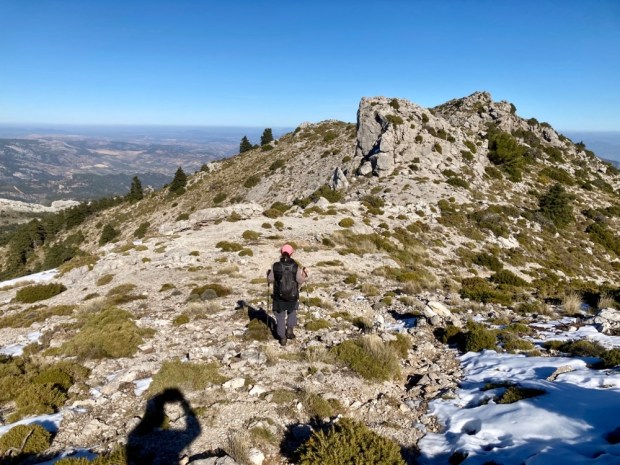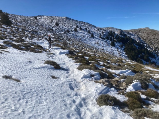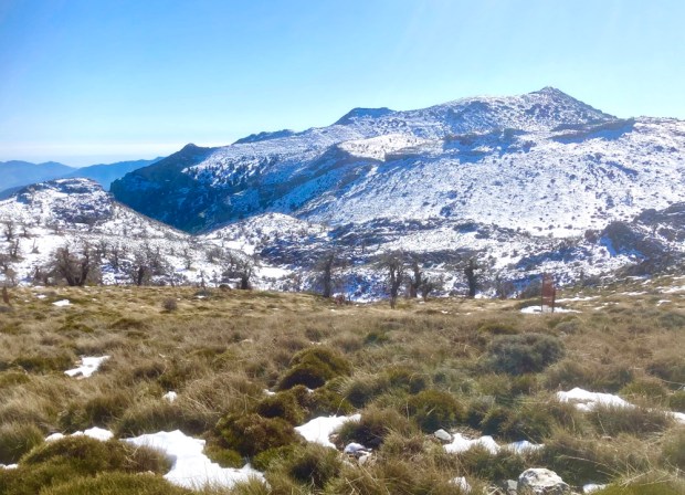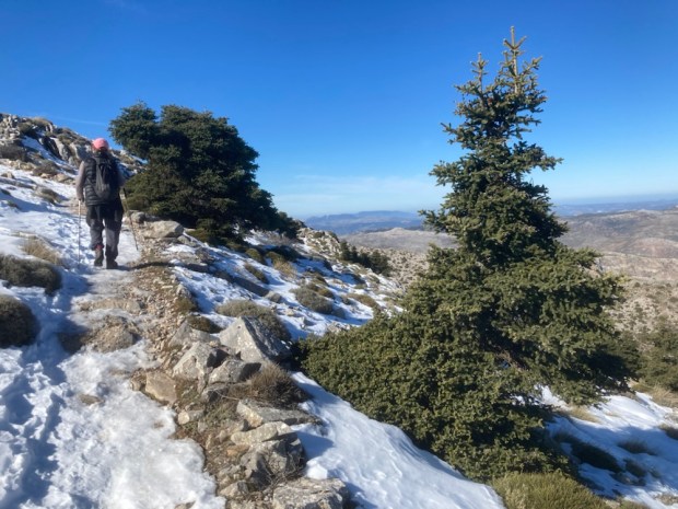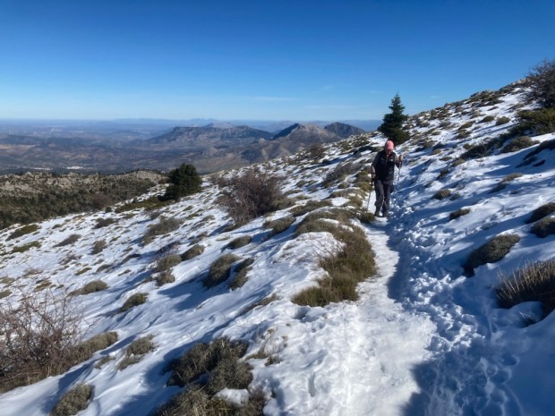 The crisp clear air, bright sun and dazzling white snow made the views over the surrounding Sierras to the distant coast even more dramatic and awe inspiring as we climbed across an icy slope studded with occasional lonely Pinsapos and recently planted galloaks towards the “wedding cake” pile of Enamorados.