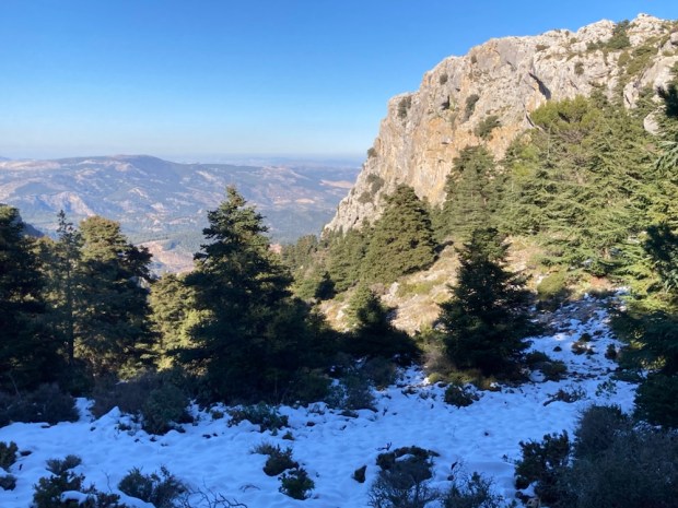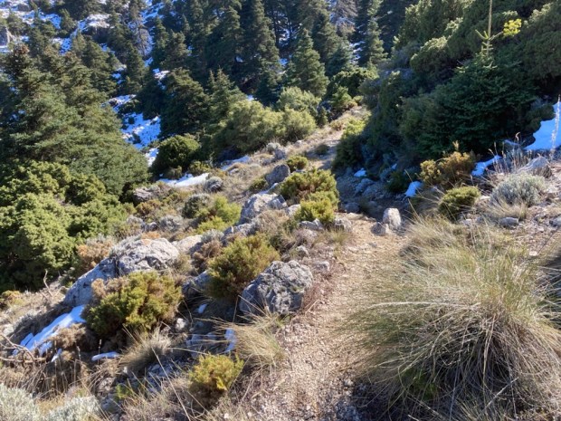 Our return leg to the mirador was on a smaller track across a coll, and along a ridge and then down to the bottom of the valley, at times a slippery slide down snowy slopes. The trail, invisible beneath its white blanket was thankfully marked by many stone cairns, leading us back into the Pinsapo forest past tracks in the snow, the nearest we got to seeing any of the deer, boar, goat or muflon that are among the rich variety of fauna living in this wilderness.